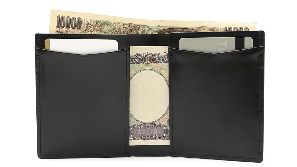 本体には、紙幣や領収書、複数のカードを収納可能。紙幣は本体の内外どちらにもしまえるため扱いやすく、ユーザーの好みに合わせて使えるギミックの効いたつくりになっています。また、お財布としてだけでなく、レシートの管理やチケットケースとしてなどマルチに活用できる汎用性の高さも魅力です。