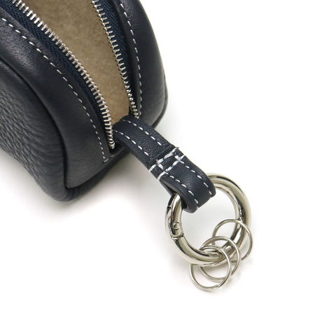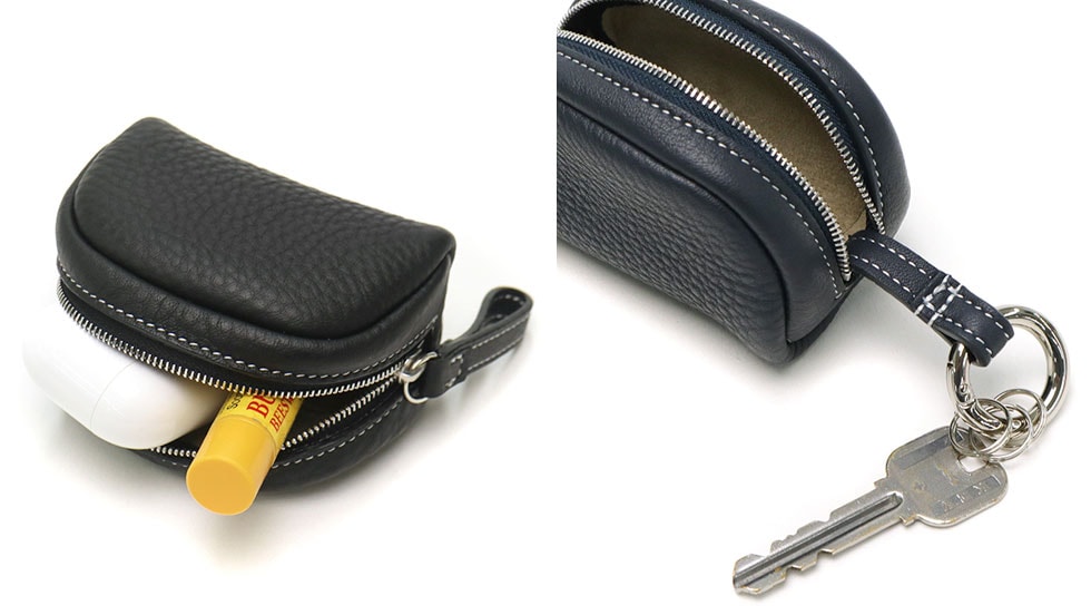 手の平に収まるコンパクトなミニポーチなので、リップなどのコスメやイヤホンなどちょっとした小物や小銭などを入れていただくように制作されています。本体内側にはキーリングが備わっているので、大切な鍵の収納にも便利できちんと管理することができます。