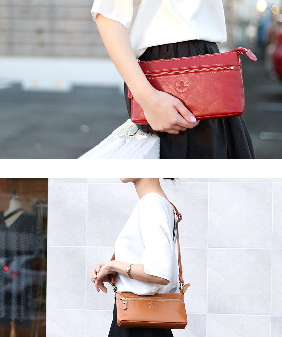 本体にはショルダーストラップを付属し、用途やスタイルに合わせてショルダースタイルやクラッチとしての手持ちスタイル、バッグインバッグとして幅広く楽しむことが可能です。