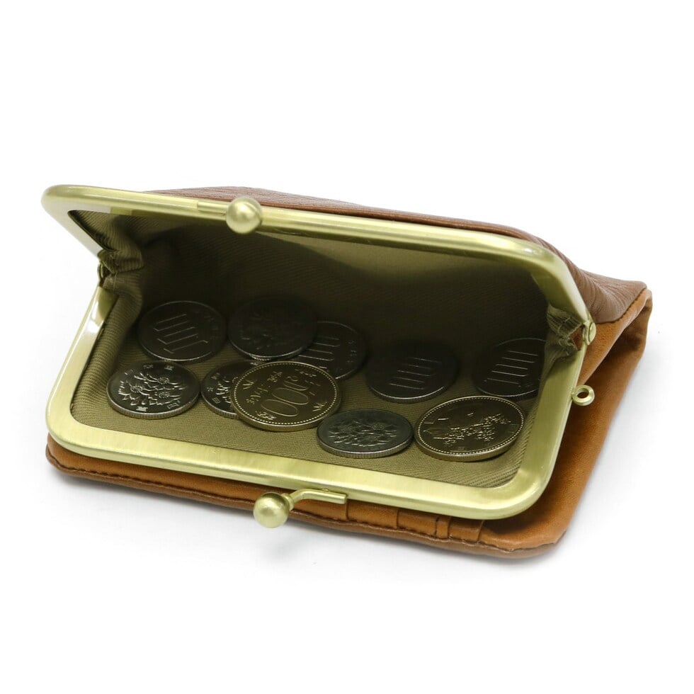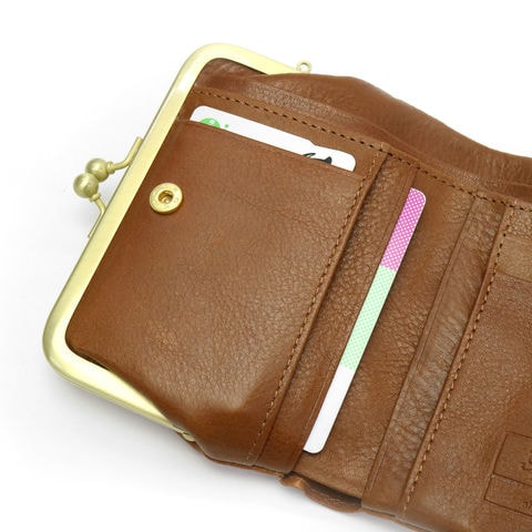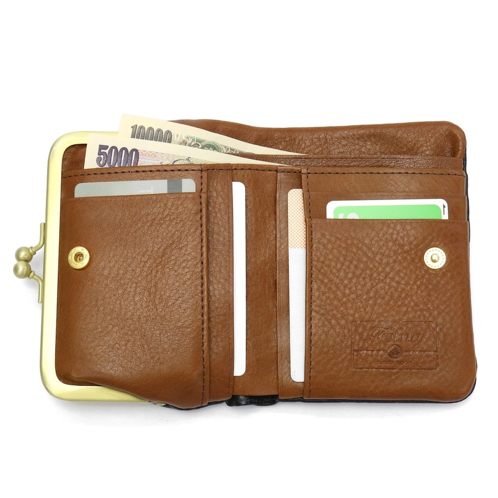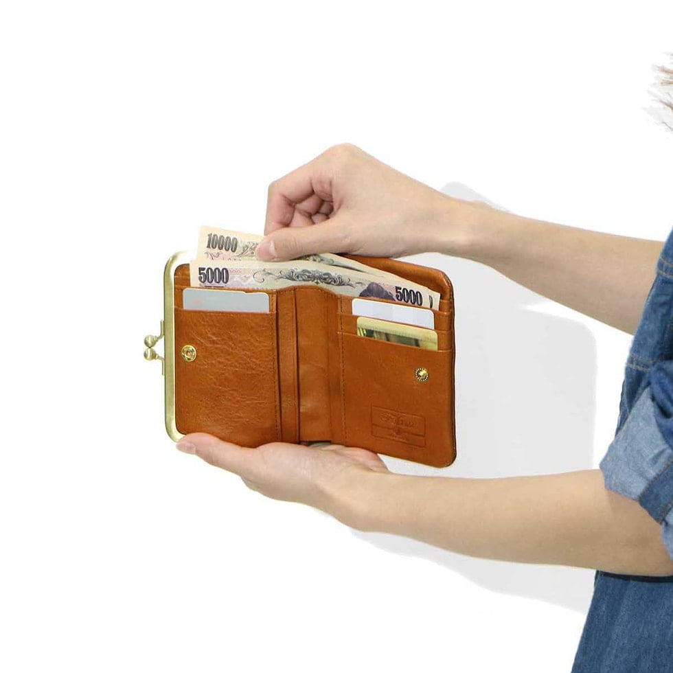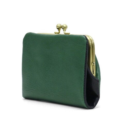 しなやかな手触りが魅力の牛革を使用した二つ折りタイプのがま口財布。丸みのあるフォルムが女性らしさを引き立ててくれる、レトロで可愛らしいアイテムです。深みのある落ち着いたカラーリングは、年齢を問わず幅広くお使いいただけます。