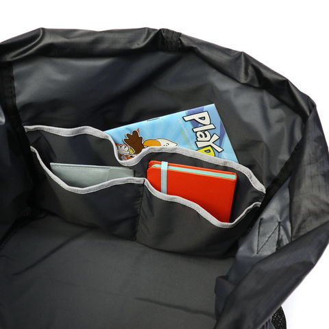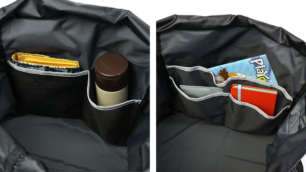内装には、仕切りポケットとメッシュポケットを装備。母子手帳やハンカチ・絵本など薄めのアイテムから、哺乳瓶やポーチなども収納可能です。目的別にアイテムを管理しやすく、すっきりと整理整頓できるデザインとなっています。