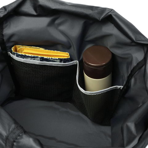 本体の両サイドにはメッシュポケットを配置。濡れた折り畳み傘やペットボトルの水滴にも対応します。少し大きめに作られているため、500mlペットボトルなら2本収納可能です。また、スマートフォンや鍵などの使用頻度の高い小物は、フロントのジップポケットがちょうど良いスペースです。