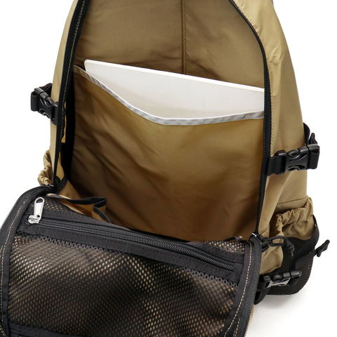 仕様 |[外側] ・ジップポケット(M)×2 ・メッシュポケット(S)×2 [内側] ・ポケット(L)×1 ・メッシュジップポケット(M)×1 ・ポケット(S)×2 [付属品] ・チェストストラップ×1