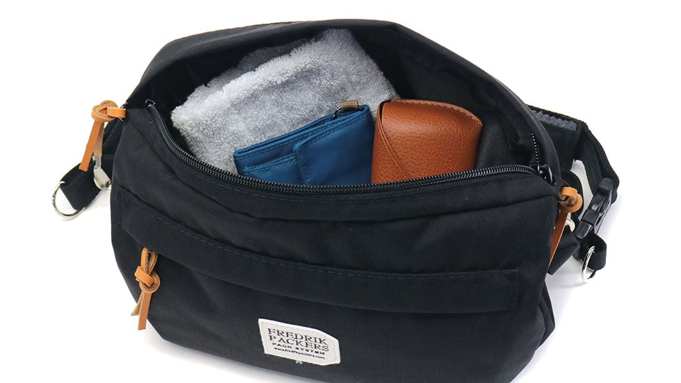 収納部は、長財布やポーチ、タオルなど身の回りのアイテムがしっかり収納でき休日のお出掛けにぴったりなサイズ感になっています。内部はポケットなどを設けないシンプルな設計で、荷物をザクザク収納できるため使い勝手も抜群です。