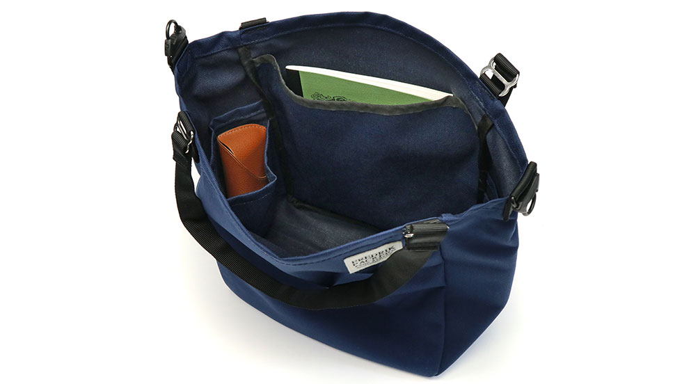 内装背面には、ノートなどがしまえるサイズのポケットを装備。さらに、両サイドに1つずつ小分けポケットを設けているので、乱雑になってしまいがちなバッグの中身もすっきりと整理することができます。