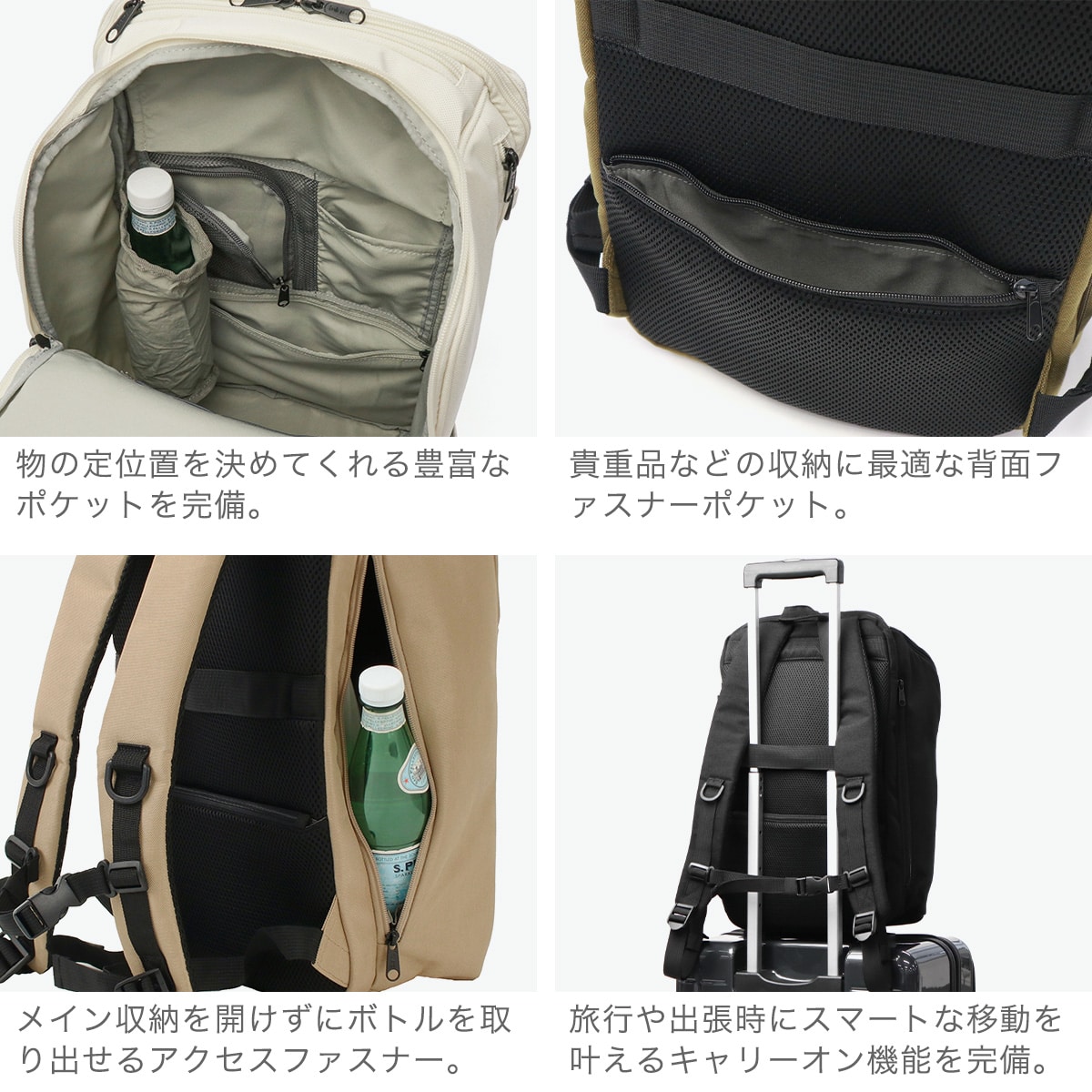 ブランドの本質とアイデンティティを表現したアイコンバッグシリーズ『ESSENCE』。こちらは、なだらかなシルエットの16L容量リュックです。扉をモチーフにしたダブルハンドルデザインが特徴で、普段使いからビジネスまでデイリーに活躍してくれるアイテムです。