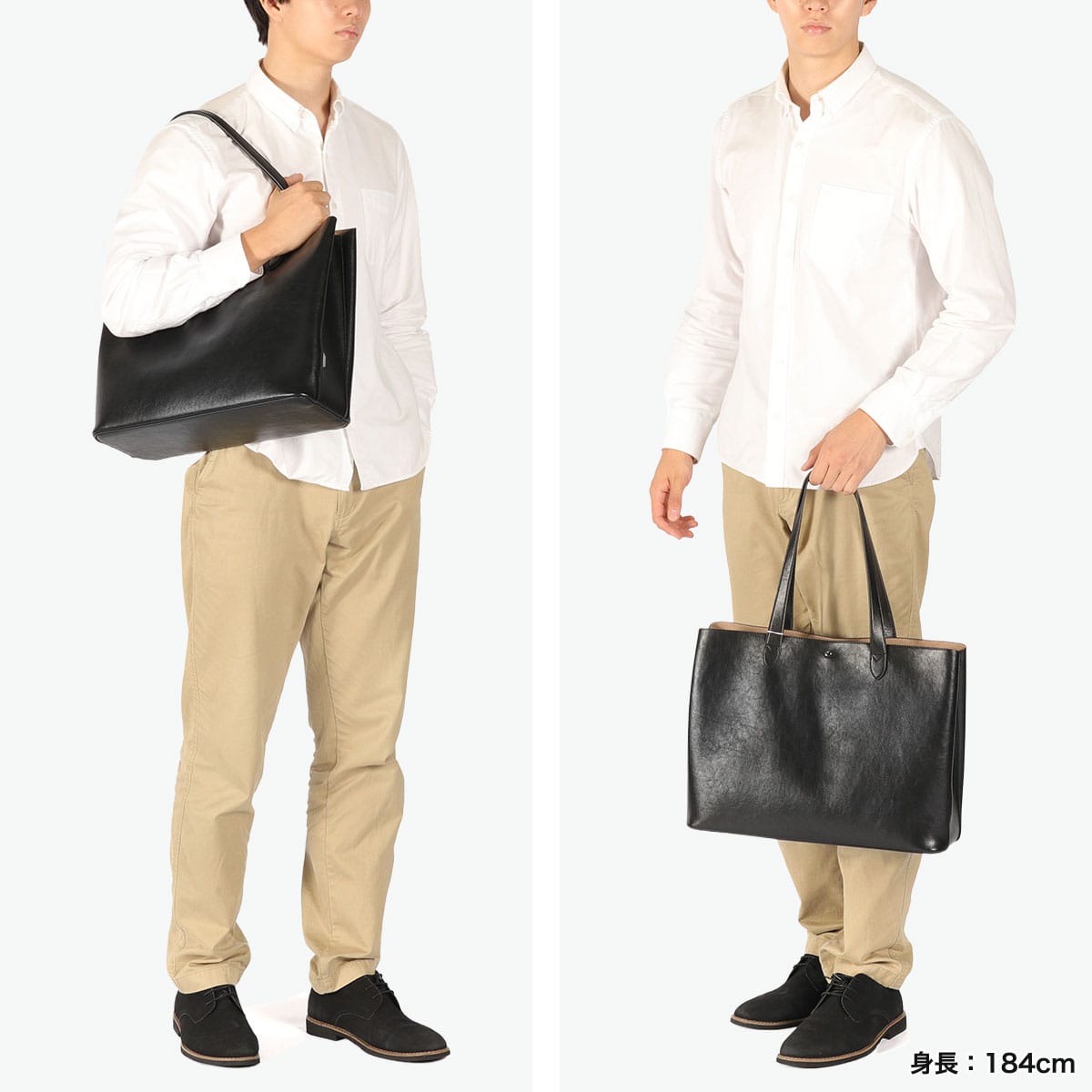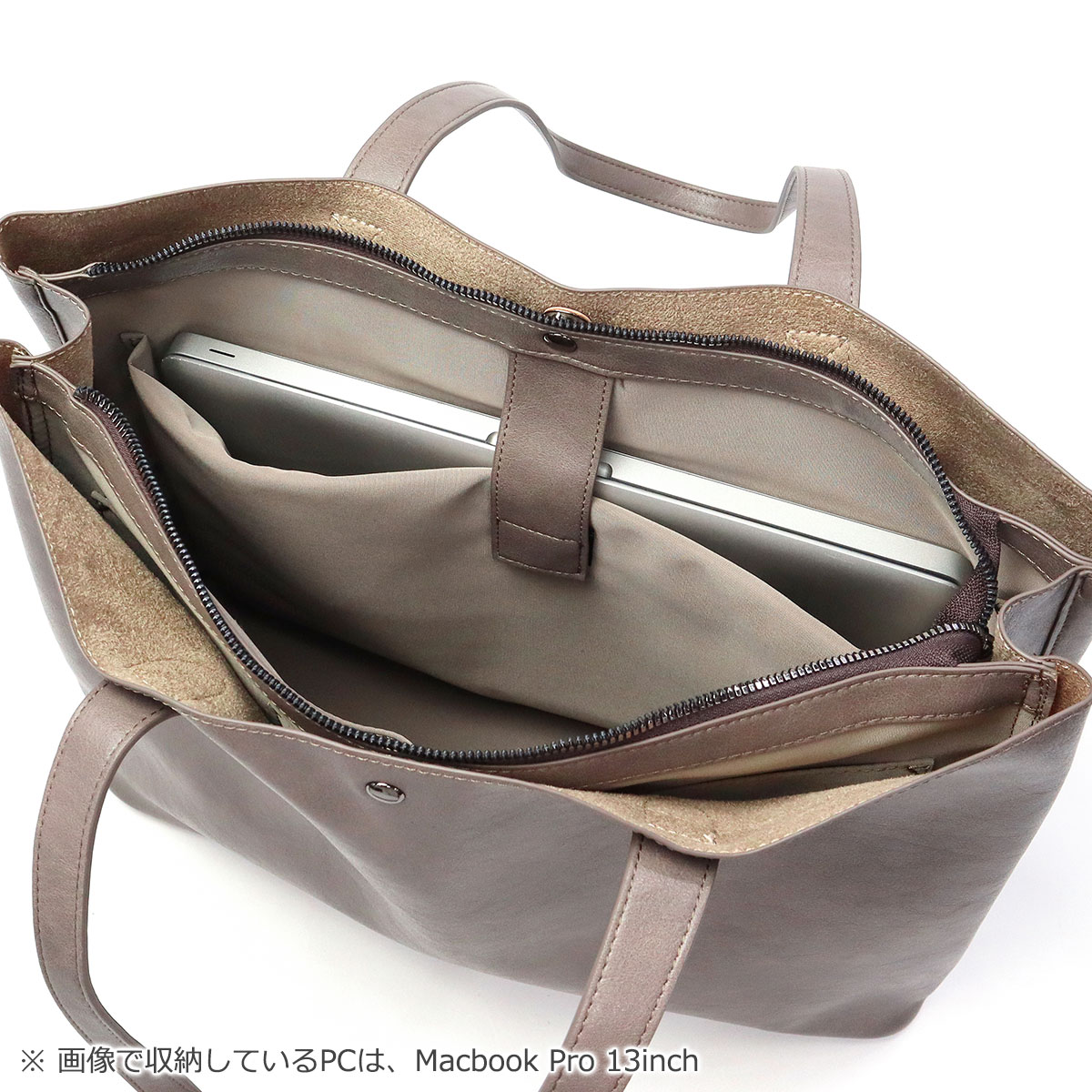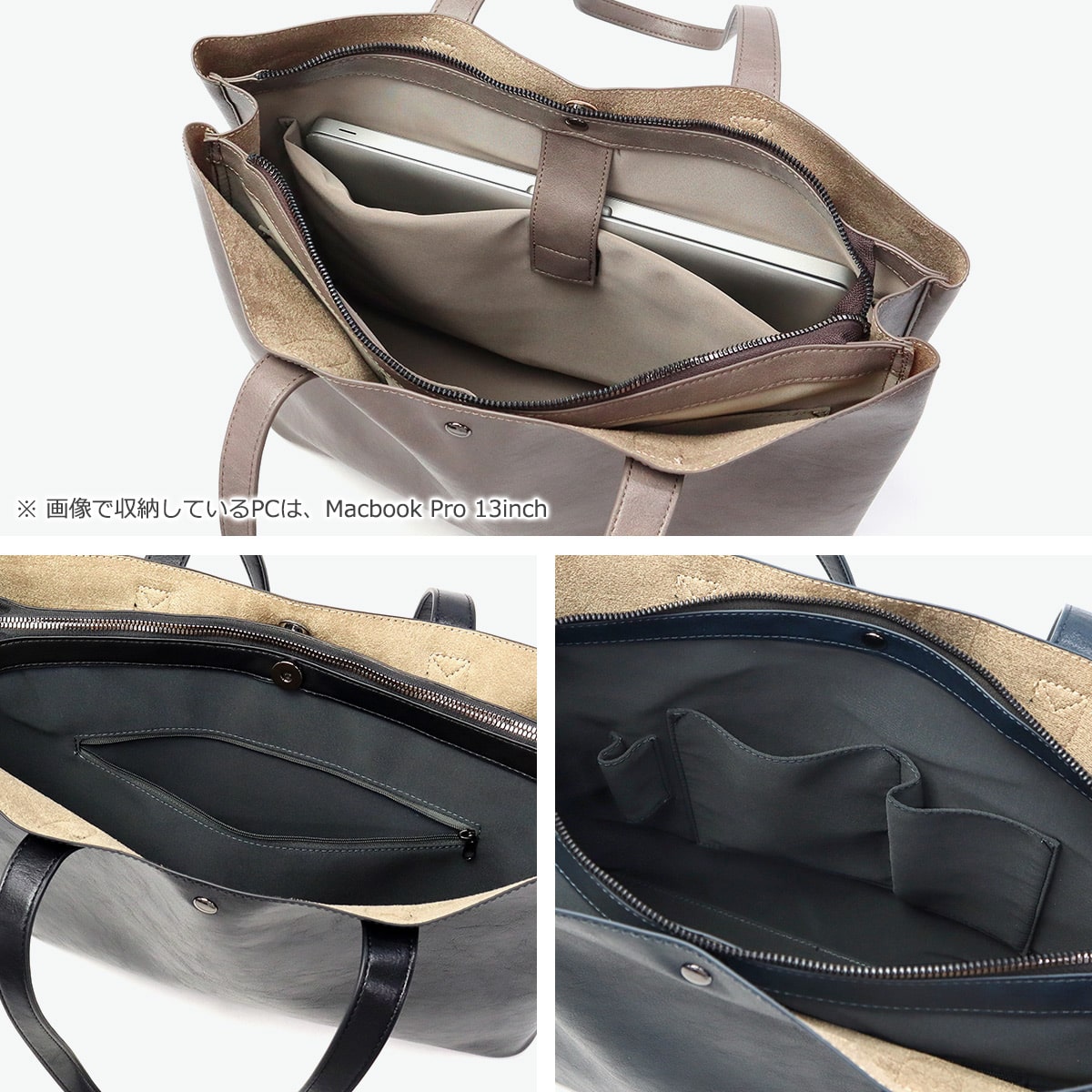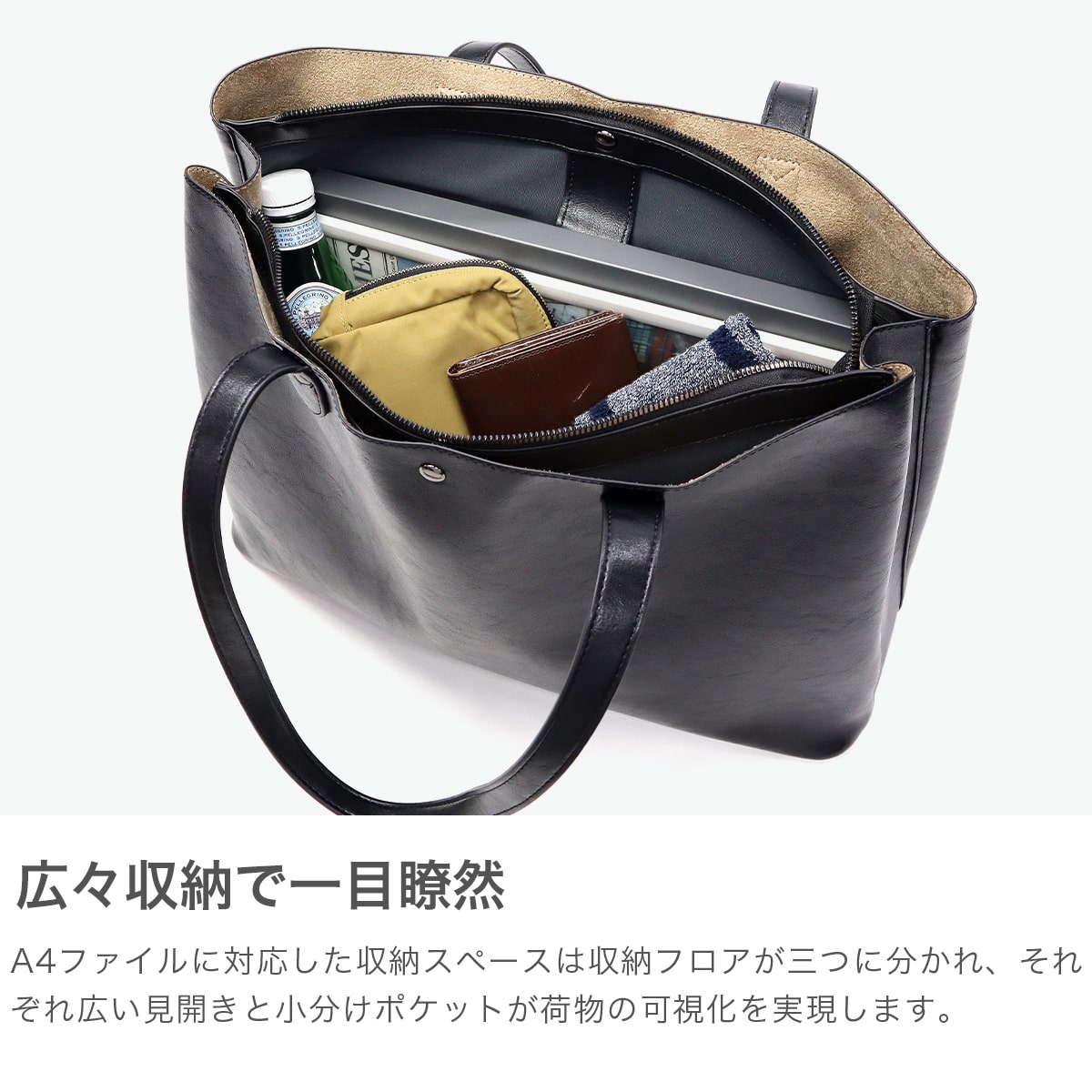 ビジネスにも日常にも活躍するマルチユースなトートバッグです。大きく開く見開き仕様で中身がひと目でわかり、PC収納を含む多彩なポケットで整理力も抜群。レザーライクな高見え素材ながら軽量で、撥水性も備えた機能派です。