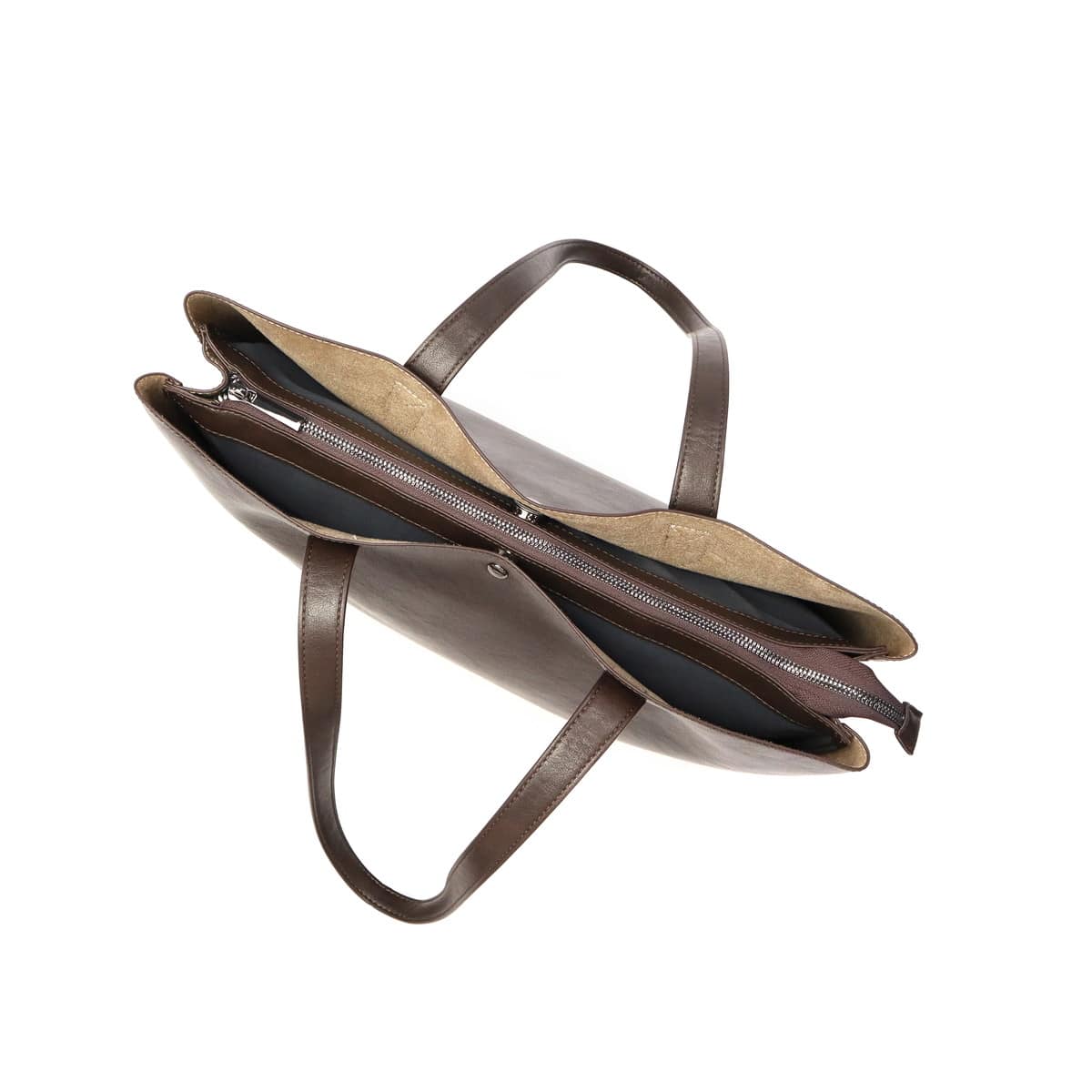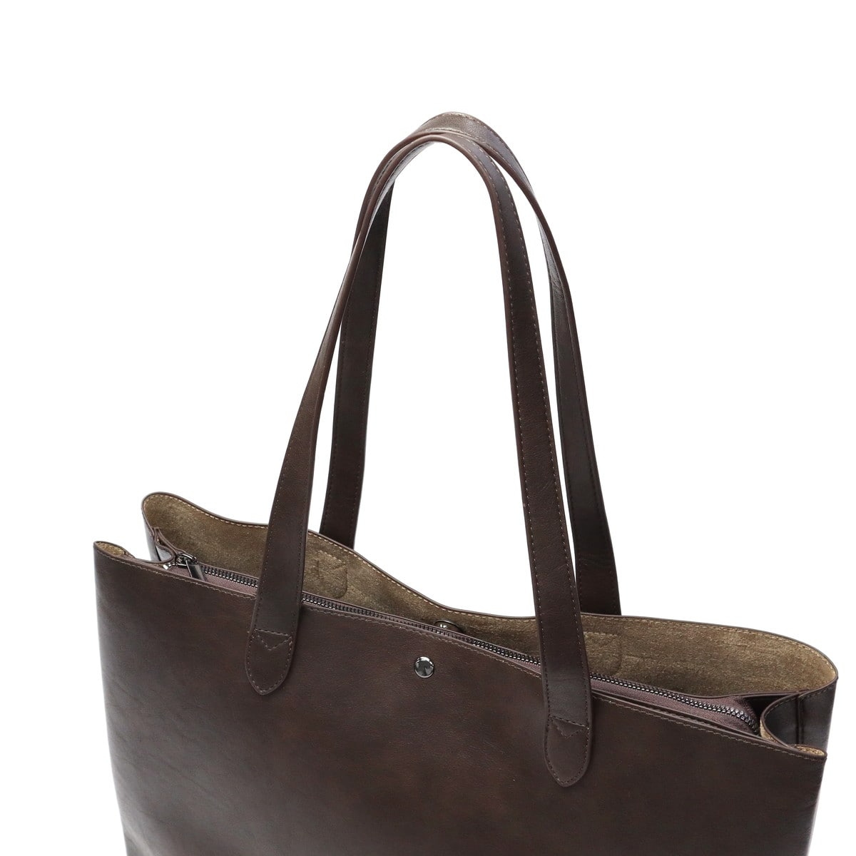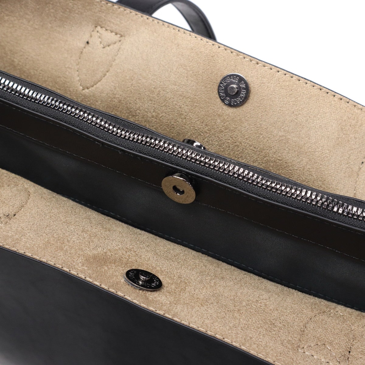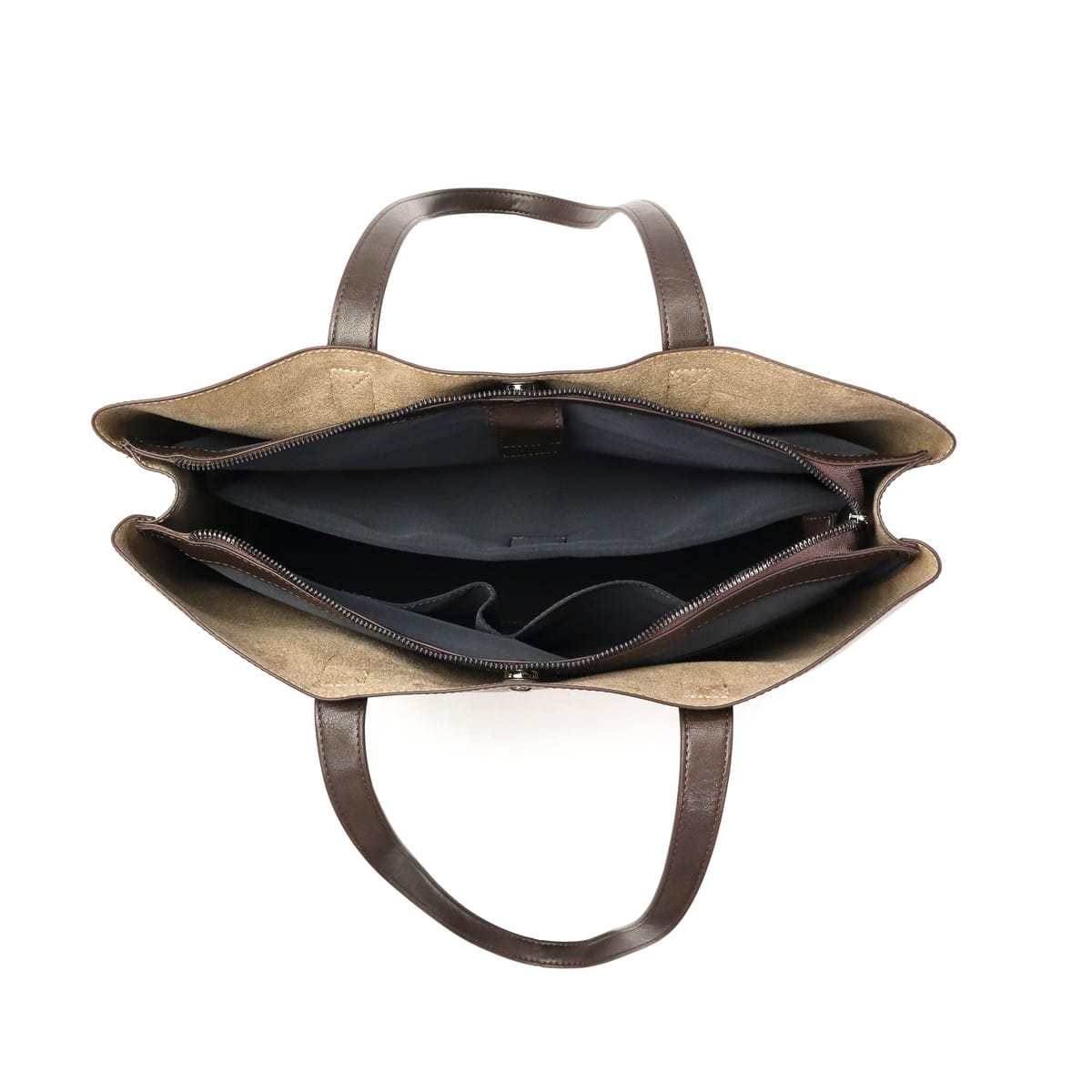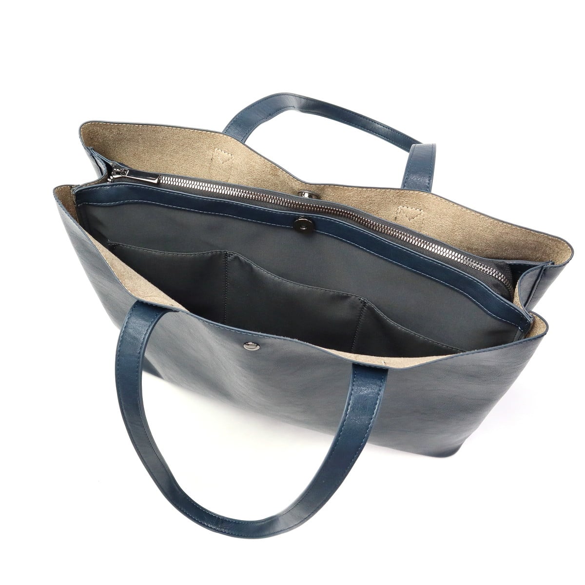 ビジネスにも日常にも活躍するマルチユースなトートバッグです。大きく開く見開き仕様で中身がひと目でわかり、PC収納を含む多彩なポケットで整理力も抜群。レザーライクな高見え素材ながら軽量で、撥水性も備えた機能派です。