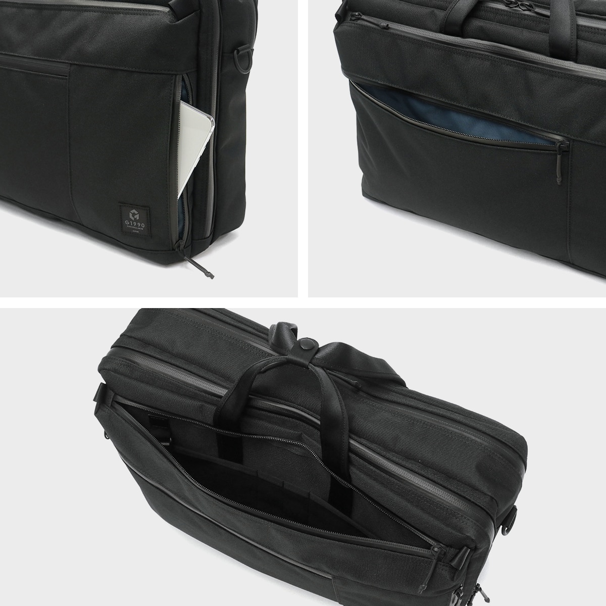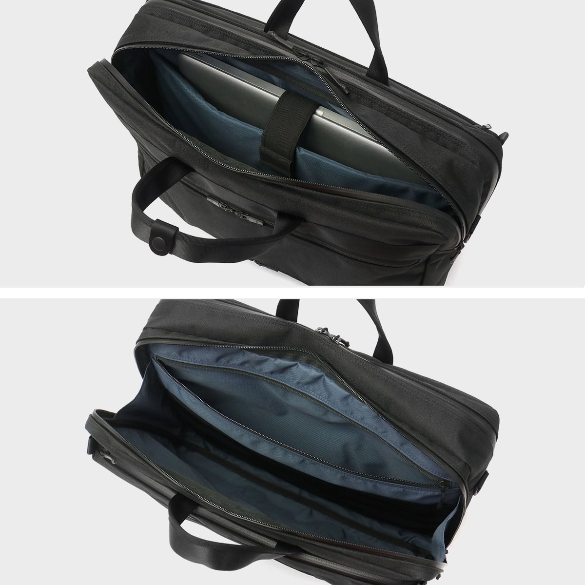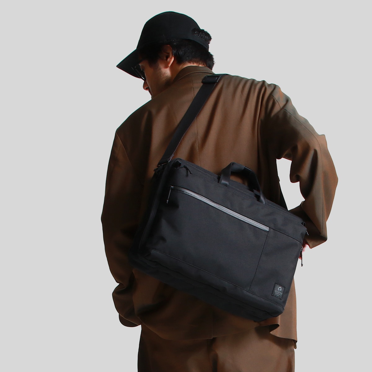 B4サイズのアイテムが収まり、多めの荷物にも対応できるサイズ感の本体。2層に分かれた収納部で、ファイルや書類などの整頓がしやすいつくりとなっています。前面収納部は開閉口がマチ底まで開き、視認性に優れた仕上がりに。背面収納部にはPC収納を搭載し、デバイス類の持ち運びも安心です。内蔵のポケットには伸縮性と強度を備えたパワーメッシュを使用し、かさばる小物も難なく収納可能。また取り外し可能なショルダーストラップを付属しており、シーンに応じて手持ち・肩掛けの2通りのスタイルでお使いいただけます。