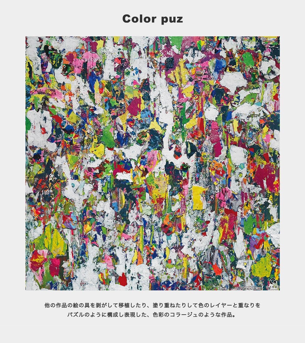 グラフィックと絵画、平面と立体、必然と偶然、抽象と具象の曖昧な境界部分を表現した作品。破いたプリントをコラージュして抽象画に仕上げています。紙を破く行為に偶然性が生まれ、必然的な配置に偶然性が入ることによって作品の深みが増します。試行錯誤を1年以上繰り返し、ようやくたどり着いた境地ですので、とても思い入れがあります。