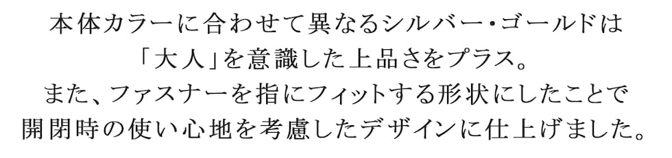 ・使用しているアルミファスナーは素材の性質上、ファスナーの開閉によってアルミの粉が生地を汚す場合がございます。また、はじめはファスナーに引っ掛かりを感じる場合がございますが、使用回数によって軽減されます。ファスナーの特性として、ご了承ください。
