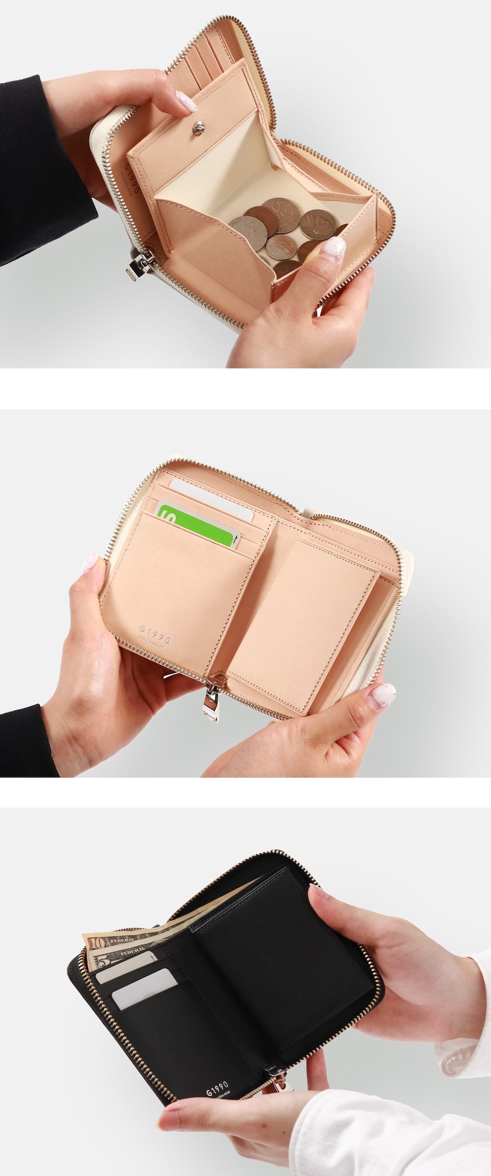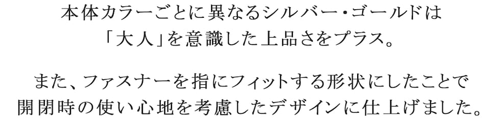 ・使用しているアルミファスナーは素材の性質上、ファスナーの開閉によってアルミの粉が生地を汚す場合がございます。また、はじめはファスナーに引っ掛かりを感じる場合がございますが、使用回数によって軽減されます。ファスナーの特性として、ご了承ください。