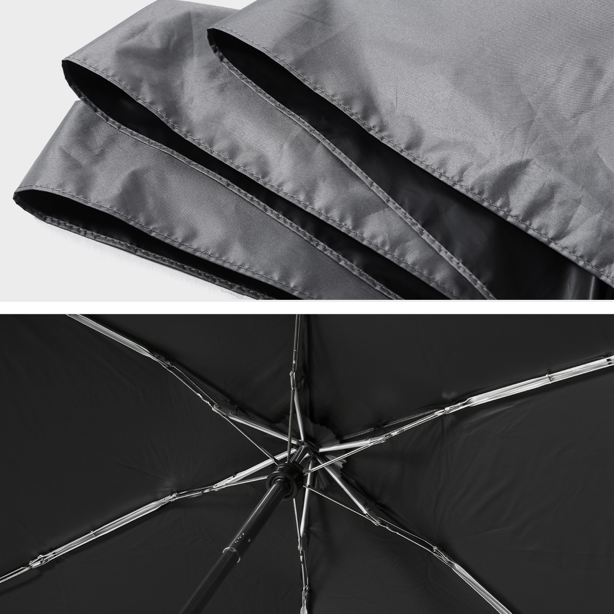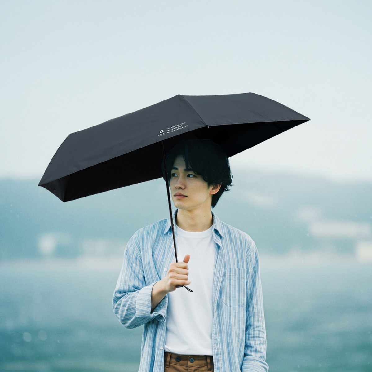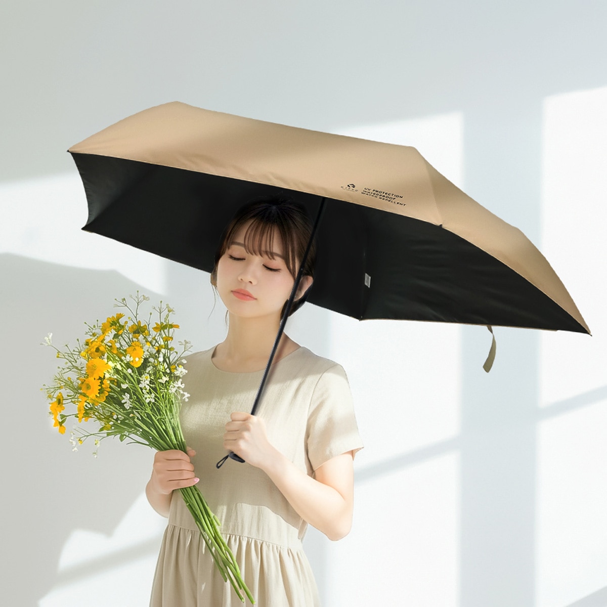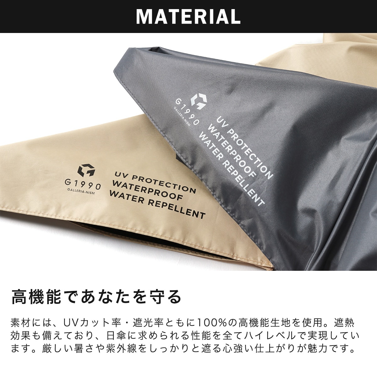 UVカット率100%、遮光率100%で遮熱効果があり、超撥水加工を施したハイスペックな生地を使用。強い日差しや急な雨からあなたを守ります。