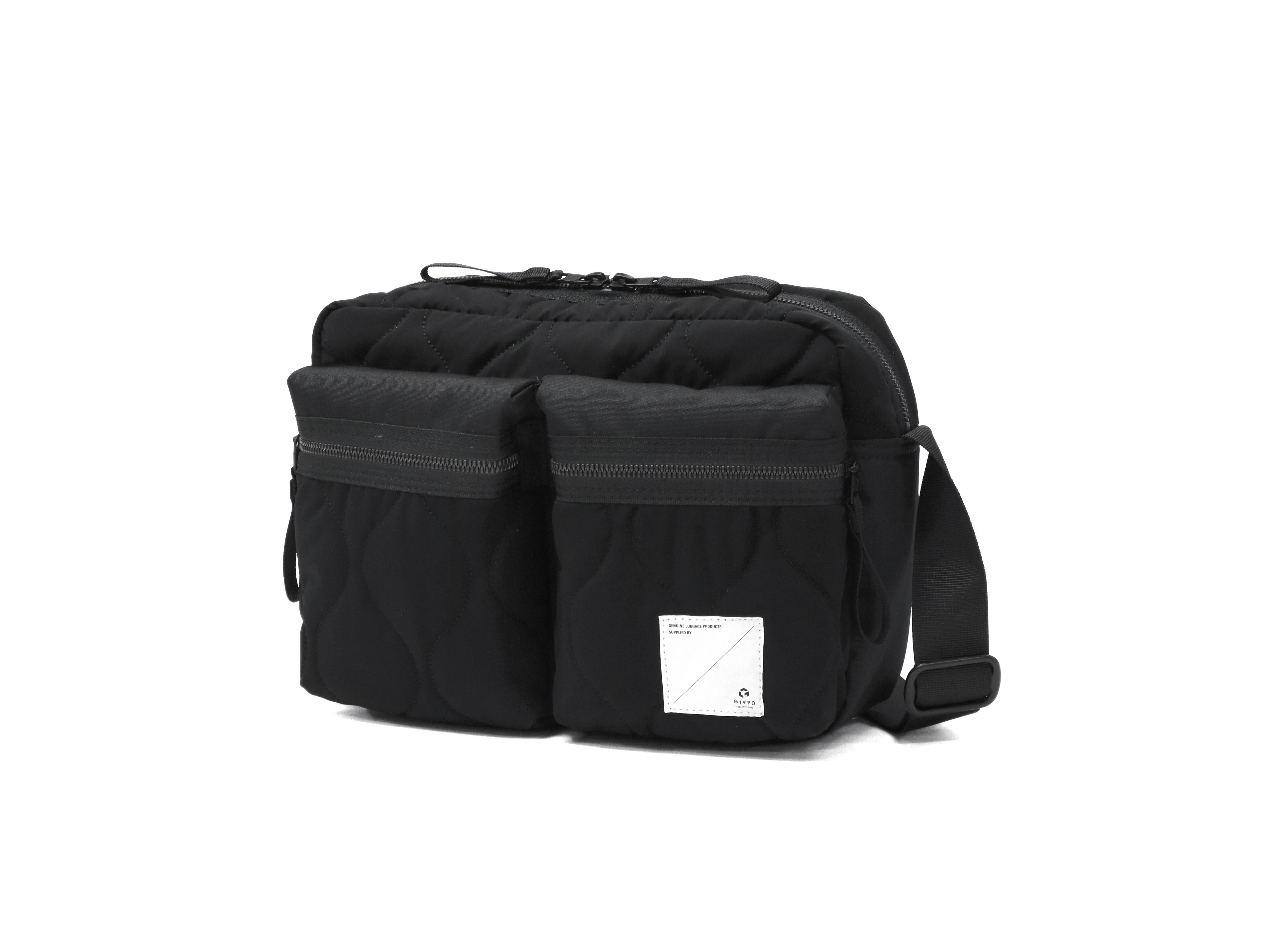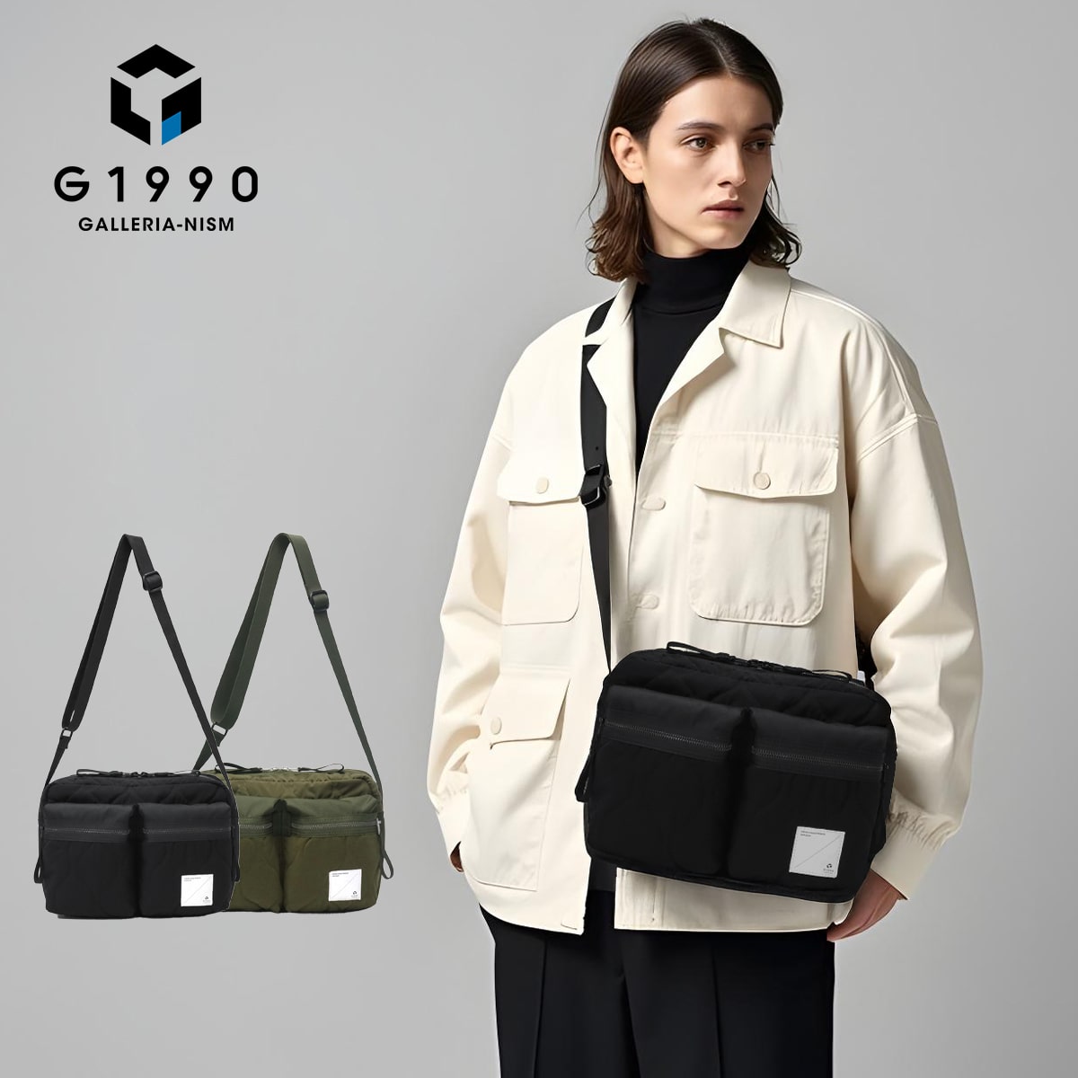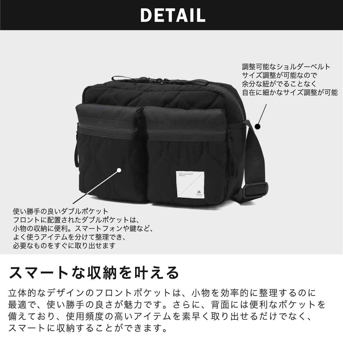 フロントのダブルポケットが特徴的なショルダーバッグ。内装にはiPadなどのタブレットを収納できるポケットを設けており、内装マチにもペットボトルなどを収納するためのオープンポケット、背面にもファスナーポケットを設けた、トラベルシーンなどでの実用性も高い仕様。