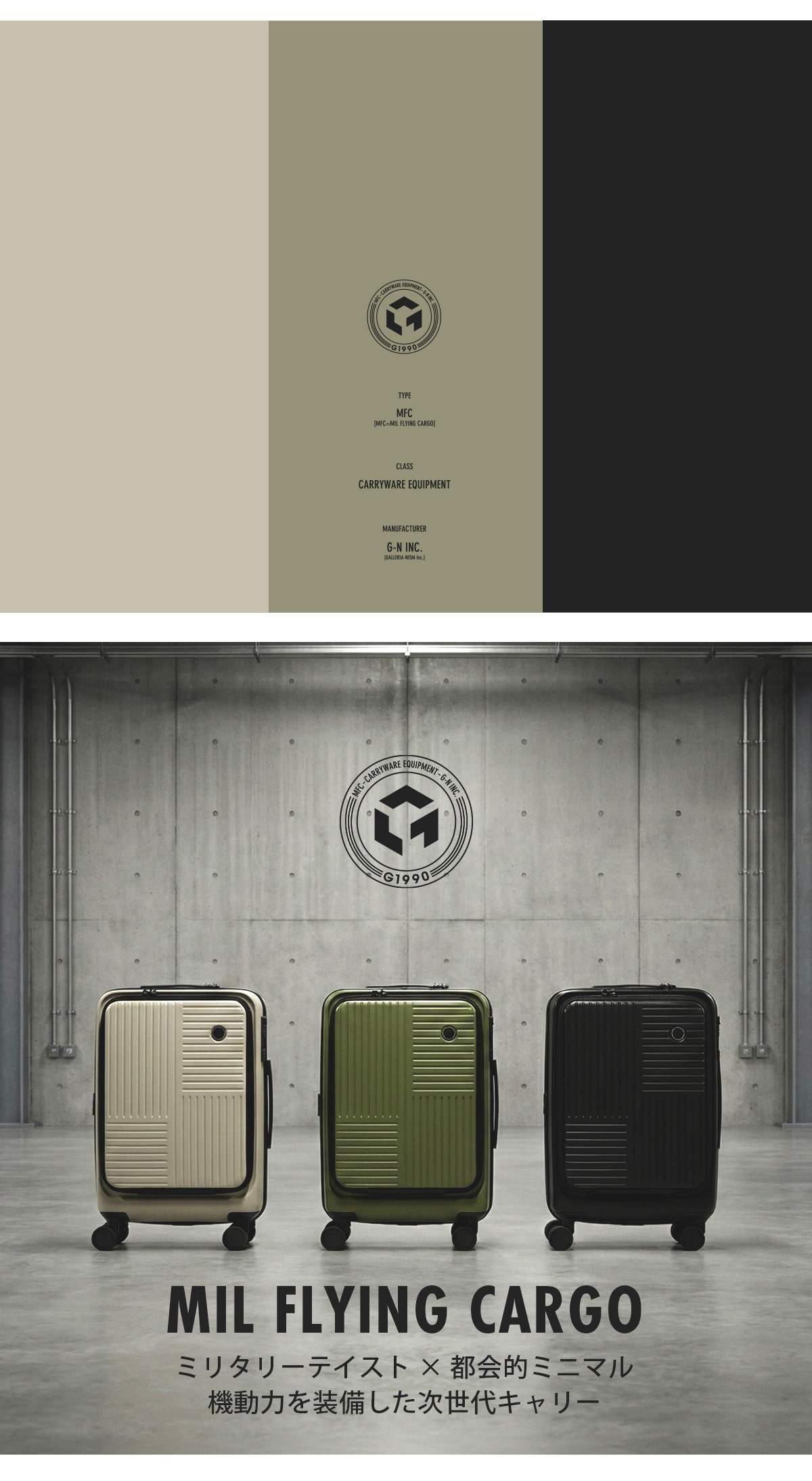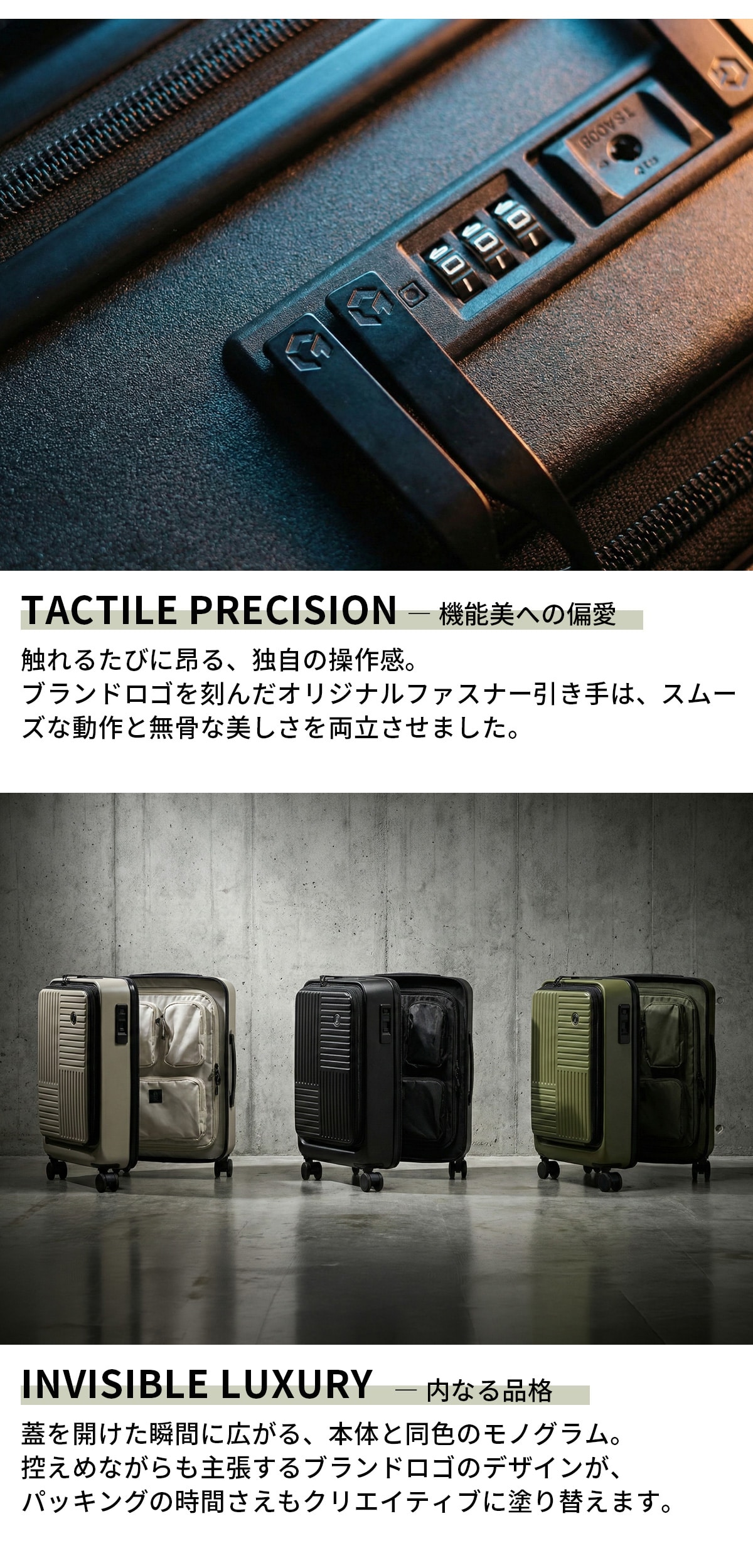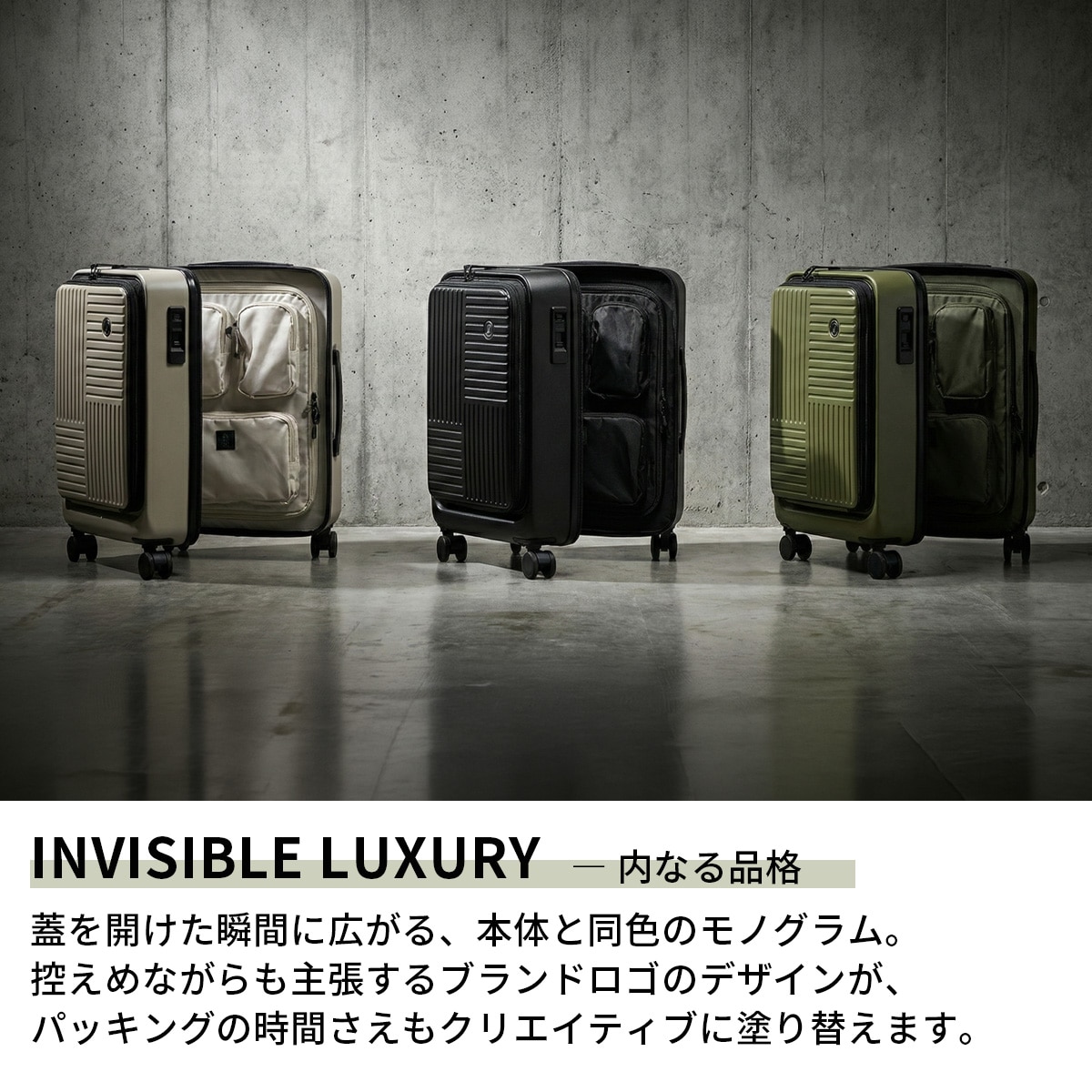 MILスペックを彷彿とさせる直線的なフォルムと、無駄を削ぎ落とした構造美が際立つキャリーケース。高い堅牢性と実用性を備えながら、都会的で洗練された印象に仕上げました。フロントオープン仕様により、移動中でもスムーズにアクセスでき、PCや書類、ガジェットをスマートに出し入れ可能。出張やワーケーションなど、多様化する現代の移動シーンに対応します。タフでありながら主張しすぎない。武骨でありながら上品。単なる荷物入れではない、“機動力”を携えた移動のためのギアです。