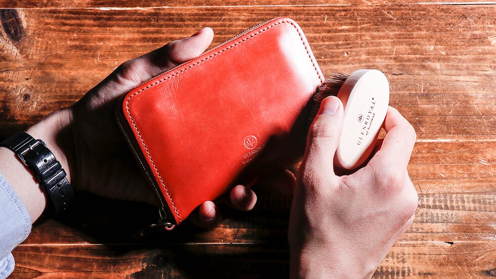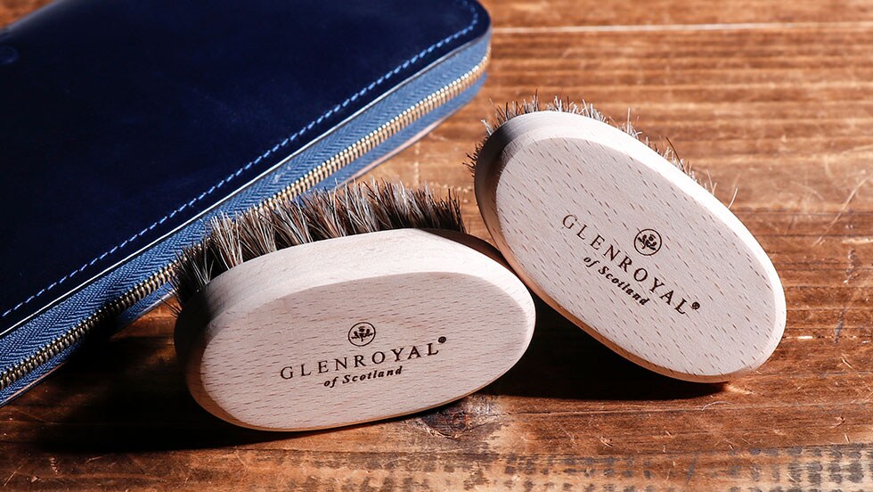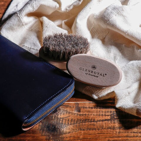 大切なレザーアイテムのお手入れに欠かせないブラシです。レザーアイテムは定期的にメンテナンスをすることで美しく変化し、末永くお使いいただけます。ブラシの毛は、ブラウンの馬毛と白馬の毛を特別ブレンドすることにより、上品な色合いに仕上げ、一つ一つ異なる、木目の美しいブナ材も特徴になっています。