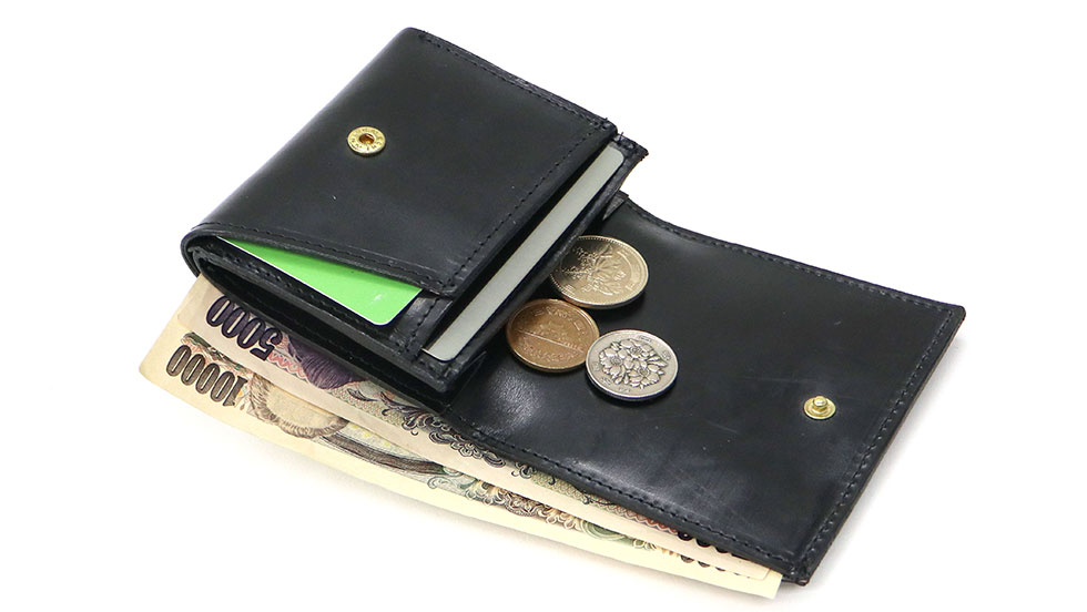 本体は、片手に収まるほどコンパクトな見た目ながら、お札や小銭、カードもしまえる必要な収納力を備えたつくり。マチ付きのポケットは、小銭入れだけでなくカードポケットとしても活用できるスペースとなっています。