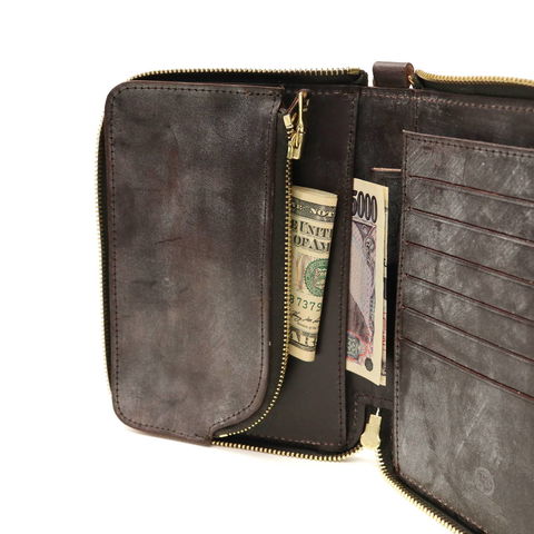 ※使用しているアルミファスナーは素材の性質上、ファスナーの開閉によってアルミの粉が生地を汚す場合がございます。また、はじめはファスナーに引っ掛かりを感じる場合がございますが、使用回数によって軽減されます。ファスナーの特性として、ご了承ください。