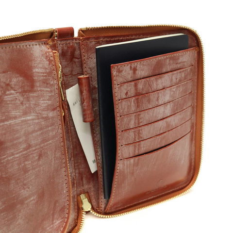 本体はパスポートや紙幣、カード類など必要な貴重品をひとまとめに管理できる収納力のあるつくり。お札は折り畳むことで、小銭入れの下や大きめのポケットなどに自由に収納可能です。普段使いも可能にしてくれるコンパクトなサイズ感で、幅広いシーンで柔軟に対応できる仕上がりとなっています。
