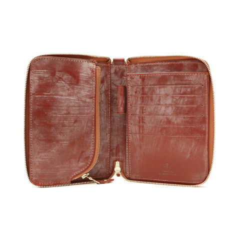 上質で透明感のあるフルブライドルレザーを使用した『GLENROYAL/グレンロイヤル』のトラベルウォレット。レザーの堅牢さとその美しい光沢感が大人の品格を醸し出します。外側に備えられたDリングにコードを通すことで、盗難、紛失防止にもなり、ファッション性と機能性を兼備したデザインも魅力のひとつです。