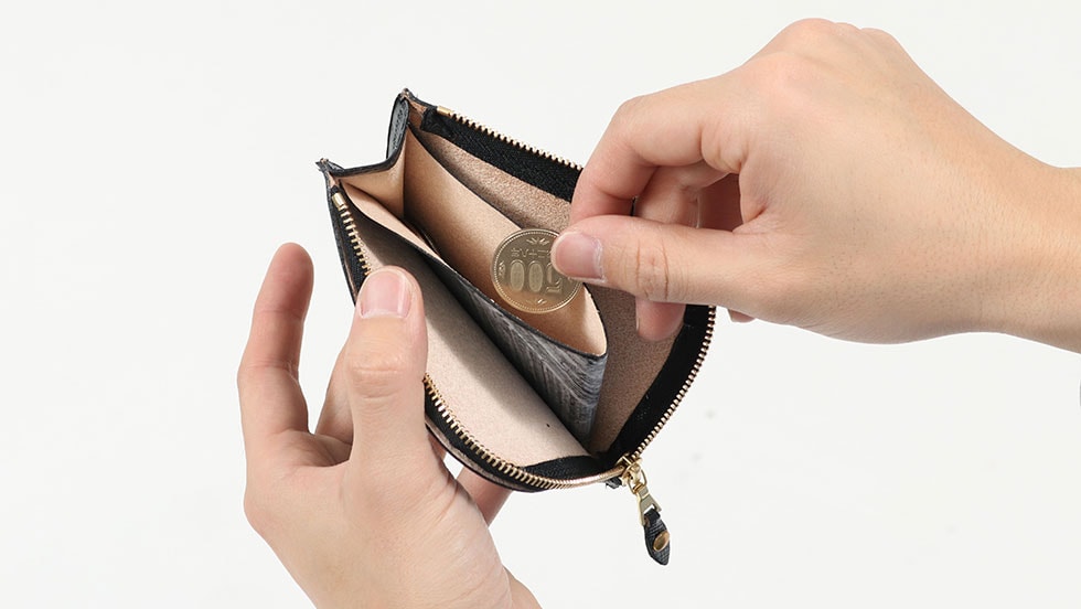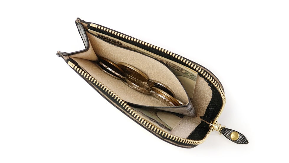 L字ファスナーの仕様に加え片マチのデザインで大きく開くので、出し入れもスムーズに行うことができます。