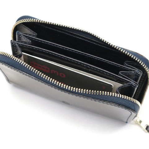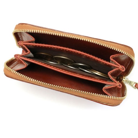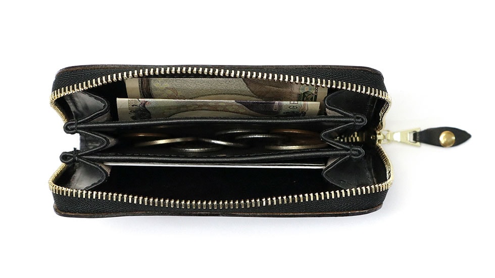 収納部は3コーパメントのジャバラ式。折り畳んだ紙幣や硬貨、カード類だけでなく、お好みで鍵などの小物も入れておくことが可能な汎用性の高いデザインが魅力となっています。ラウンドファスナータイプの収納部は収納したものを確認しやすく、出し入れが行いやすくなっているのもポイントです。