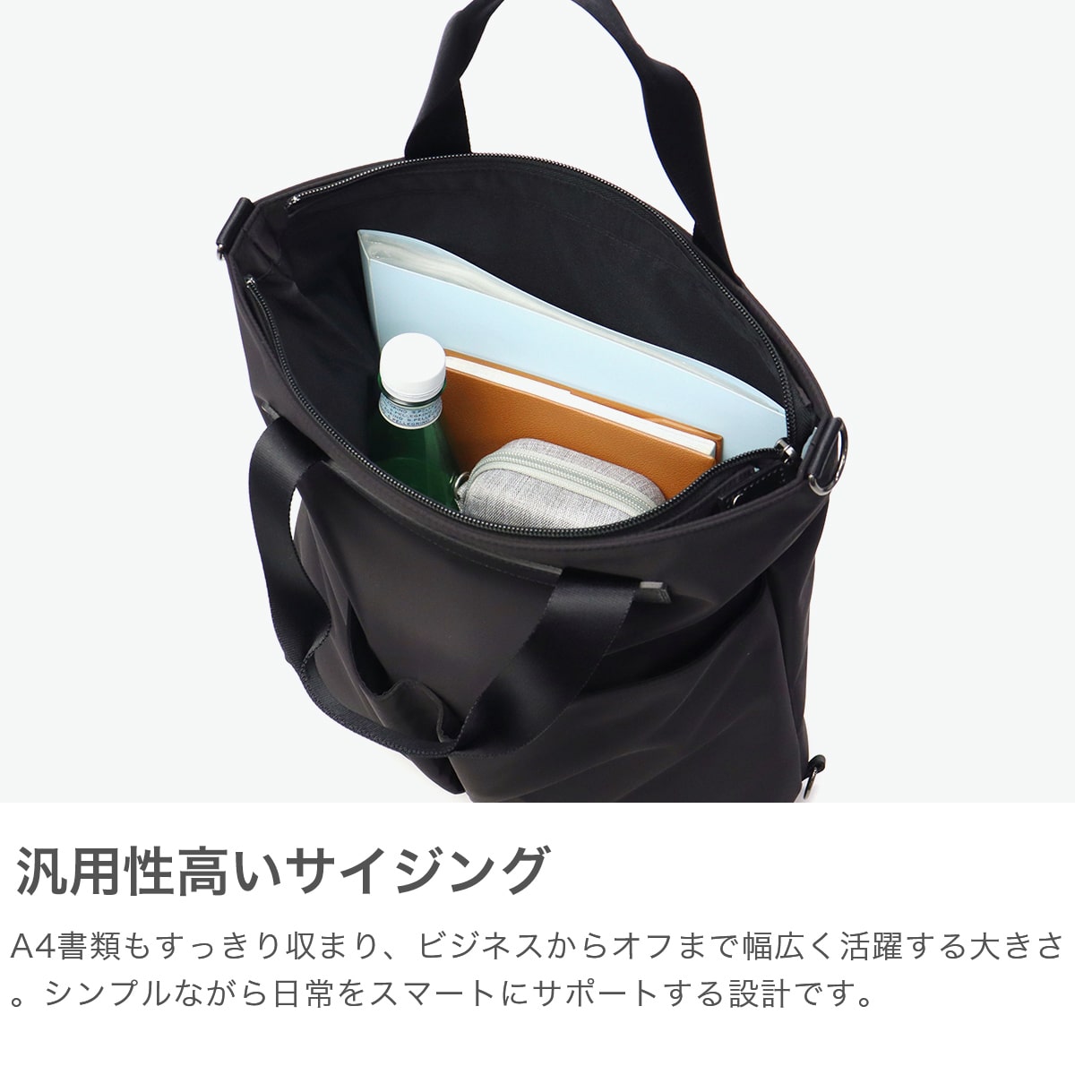 オンオフ問わず活躍する3WAYトートバッグ。トート・ショルダー・リュックの3つの使い方ができるため、シーンに合わせて柔軟なスタイルチェンジが可能です。フロントには500mlのペットボトルが収まる便利なポケットも完備しています。素材は撥水加工を施したナイロンツイルとブライドルレザーを組み合わせ、上品な雰囲気を演出。シンプルながらも高級感があり、長く愛用するほどに経年変化を楽しめます。