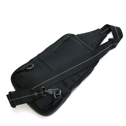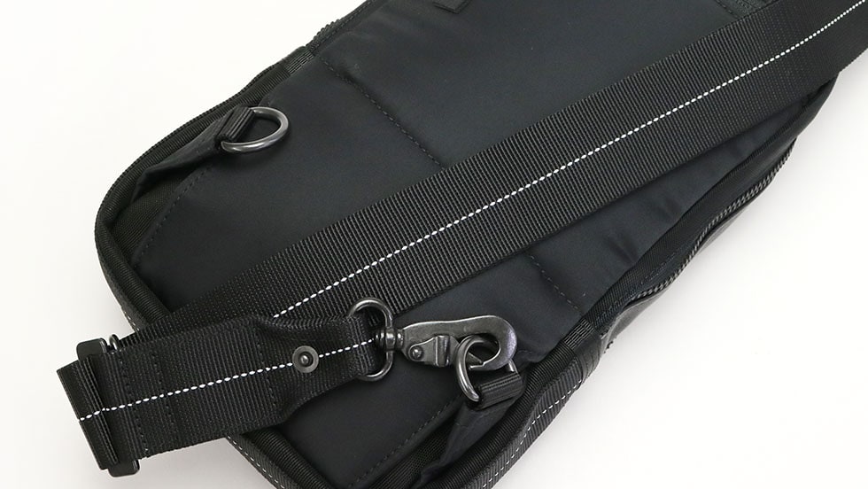 ショルダーストラップは、左右どちらでも付け替えられる仕様になっており、利き手を選ばない、使い勝手の良い設計です。また、背面にもジップポケットを設けており、貴重品の収納にも便利です。