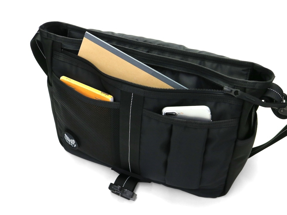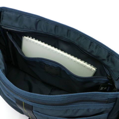 メイン収納部はA4サイズがゆったりと入るサイズ感。マチ幅もしっかりと設けられており、普段持ち歩くアイテムにプラスアルファのアイテムを収めていただけます。A4サイズのファイルも余裕をもって入るので通勤や通学にもおすすめです。内外にはポケットも設けられているため、アイテムの種別管理や、小物類の整理にも長けた設計となっています。
