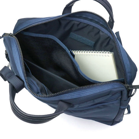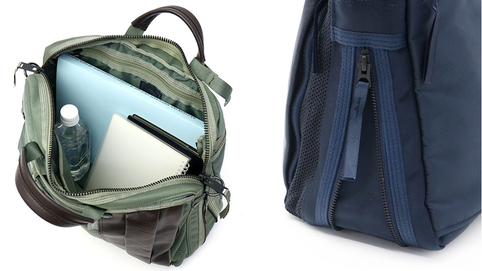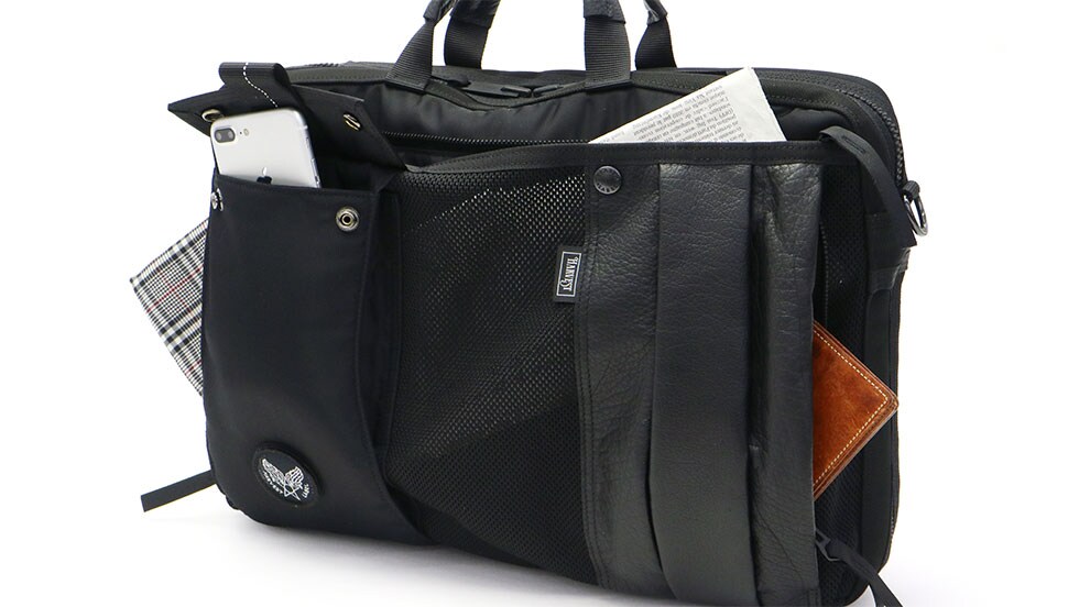 メインルームはB4サイズに対応し、A4サイズのファイルも余裕をもって収めていただくことが可能です。内部には視認性の良いメッシュ素材を使用したポケットなどを計5ヶ所設け、内部が整理しやすいようなつくりになっています。また、出先で荷物が多くなってしまった日にも安心のエキスパンダブル機能を搭載した嬉しい仕上がりになっています。
