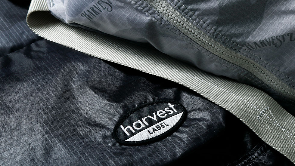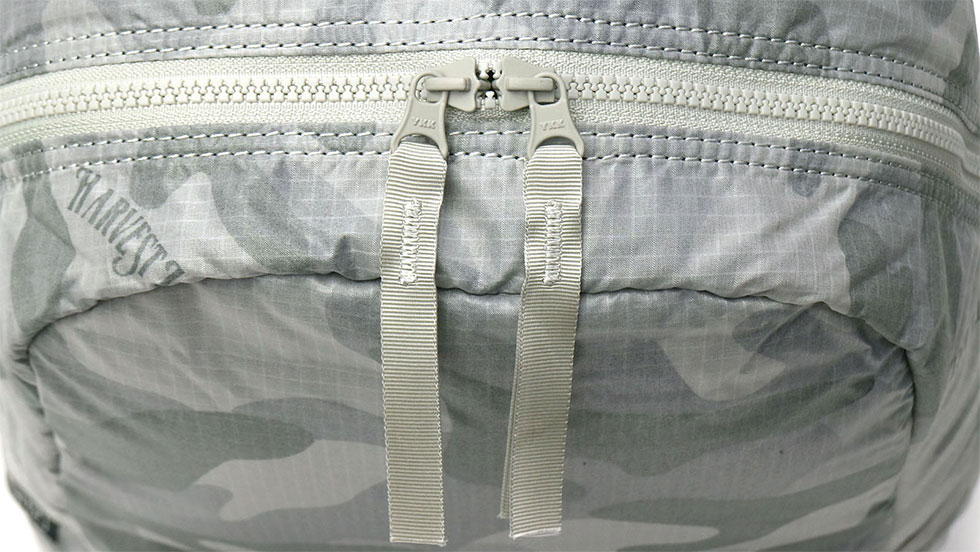 柔軟性の高い本体生地に対応するため、金属ファスナーではなく樹脂製のYKK社ビスロンファスナーを採用。軽量のスライダーは、動きがスムーズで開閉時に周囲の生地に負担をかけません。