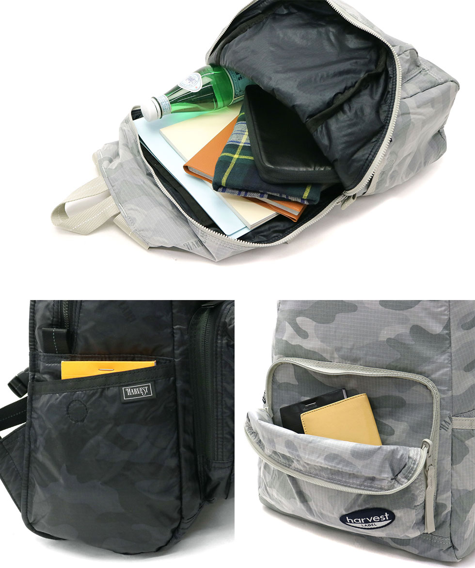 ダブルファスナー開閉のメインルームは、A4サイズに対応した使い勝手の良いサイズ感。一日に必要な荷物が余裕を持って収まります。内外ともに大きさの異なるポケットを複数設け、小分け管理にも優れた設計です。