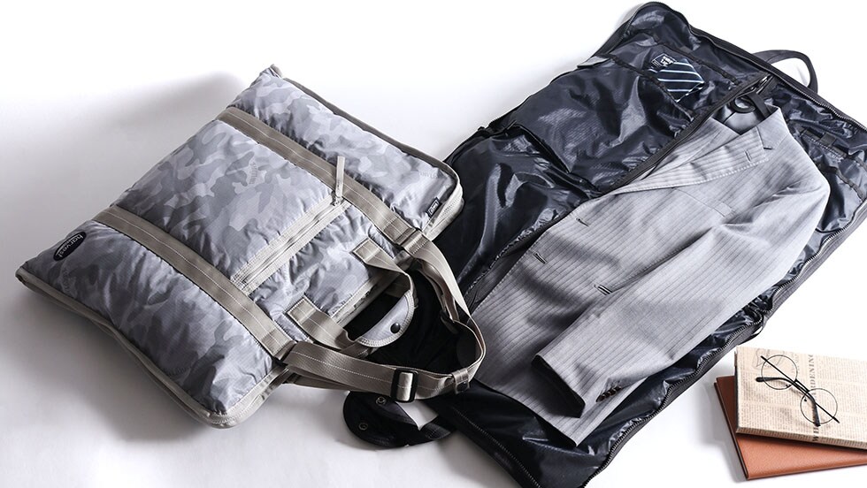 柔らかな生地と迷彩が魅力のガーメントバッグ