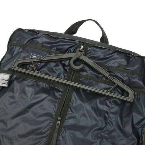 ハンガーをふたつ付属した収納部は、スーツや礼服をすっきりと収納できます。内装ポケットには畳んだYシャツやネクタイ、ハンカチなどの収納に適したポケットを装備。また、フロントには、使用頻度の高いアイテムの収納に便利なジップポケットを備えました。