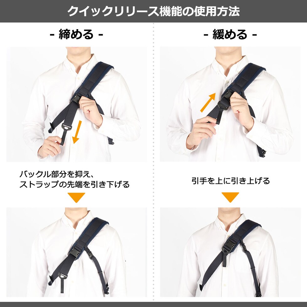 詳細説明 ショルダーストラップには太めのテープを採用し、パッドを厚く太くすることで負荷を感じさせにくい仕様になっています。付属の補助ストラップをショルダー部分からバッグ底辺に装着すれば、3点留め仕様になりよりホールド感を高めます。