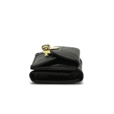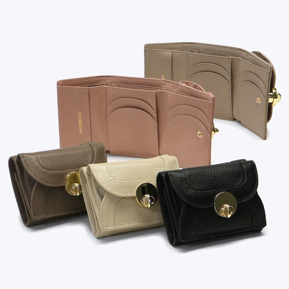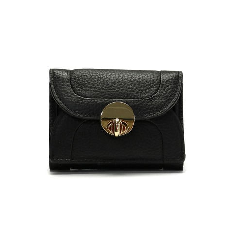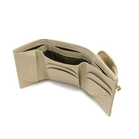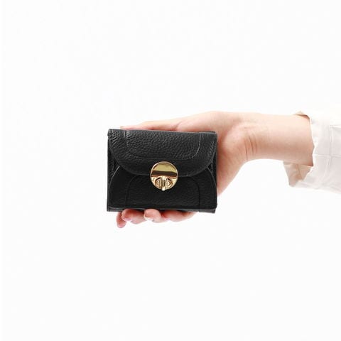 収納力もデザイン性も兼ね備えた三つ折りミニウォレット。小銭入れやお札入れも大きく開く設計で、出し入れがスムーズに行えるのが嬉しいポイント。上品なレザーに、丸いゴールドの金具をあしらうことで、女性らしさと高級感をプラスしたルックスに仕上がっています。