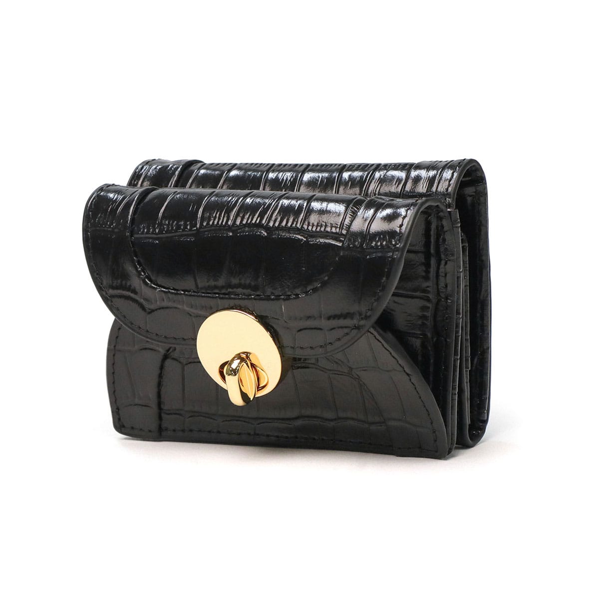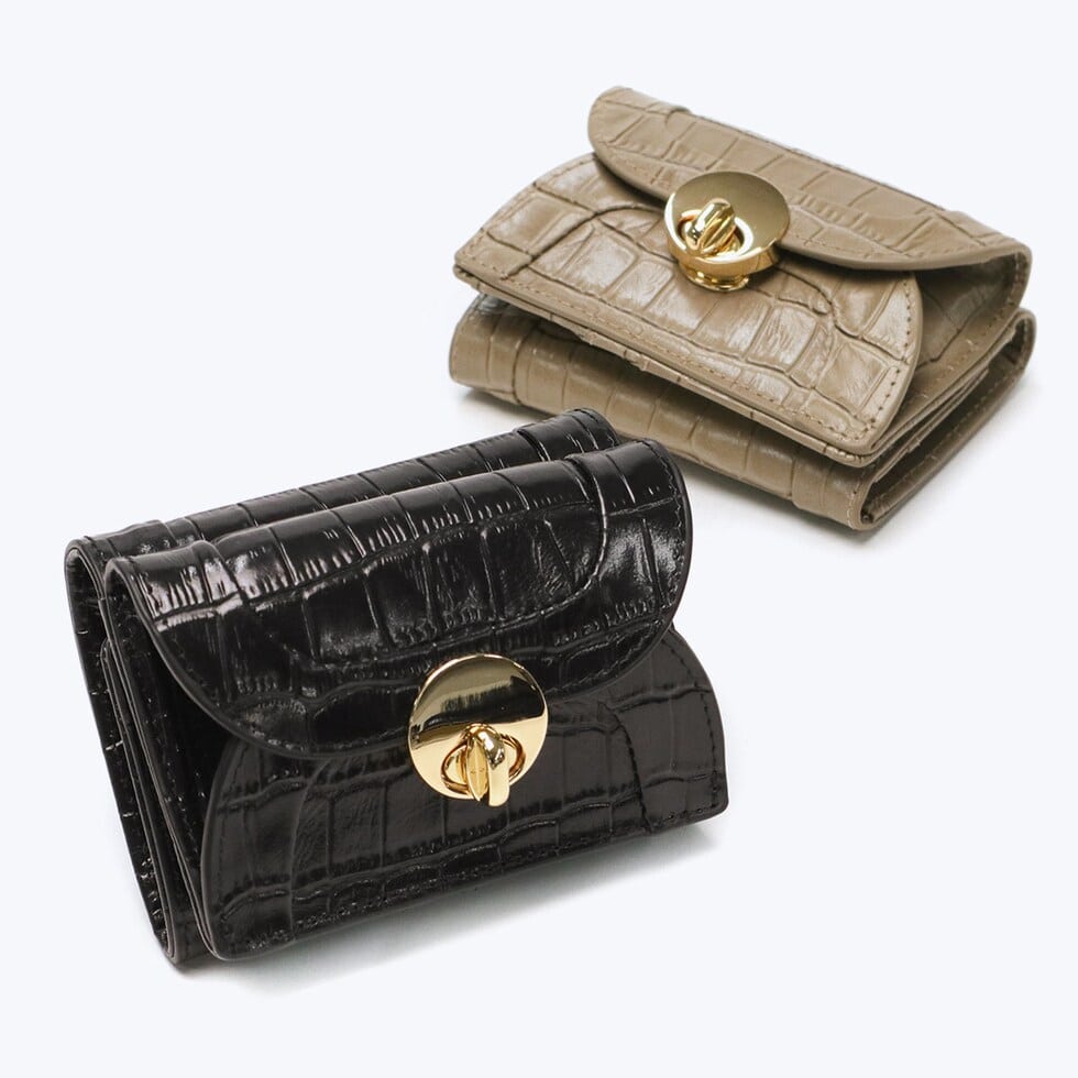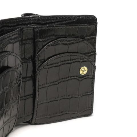 人気定番モデルをクロコ型押しした、三つ折りウォレット。本体は、小銭入れやお札入れも大きく開く使い勝手の良い設計に。さらにカード入れを7つ、ポケットが3つなど収納スペースを多数搭載しています。また上品なレザーに、丸いゴールドの金具をあしらうことで、女性らしさと高級感をプラスしたルックスに仕上がっています。