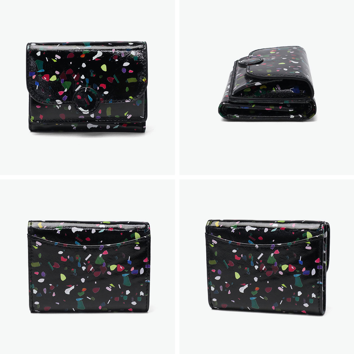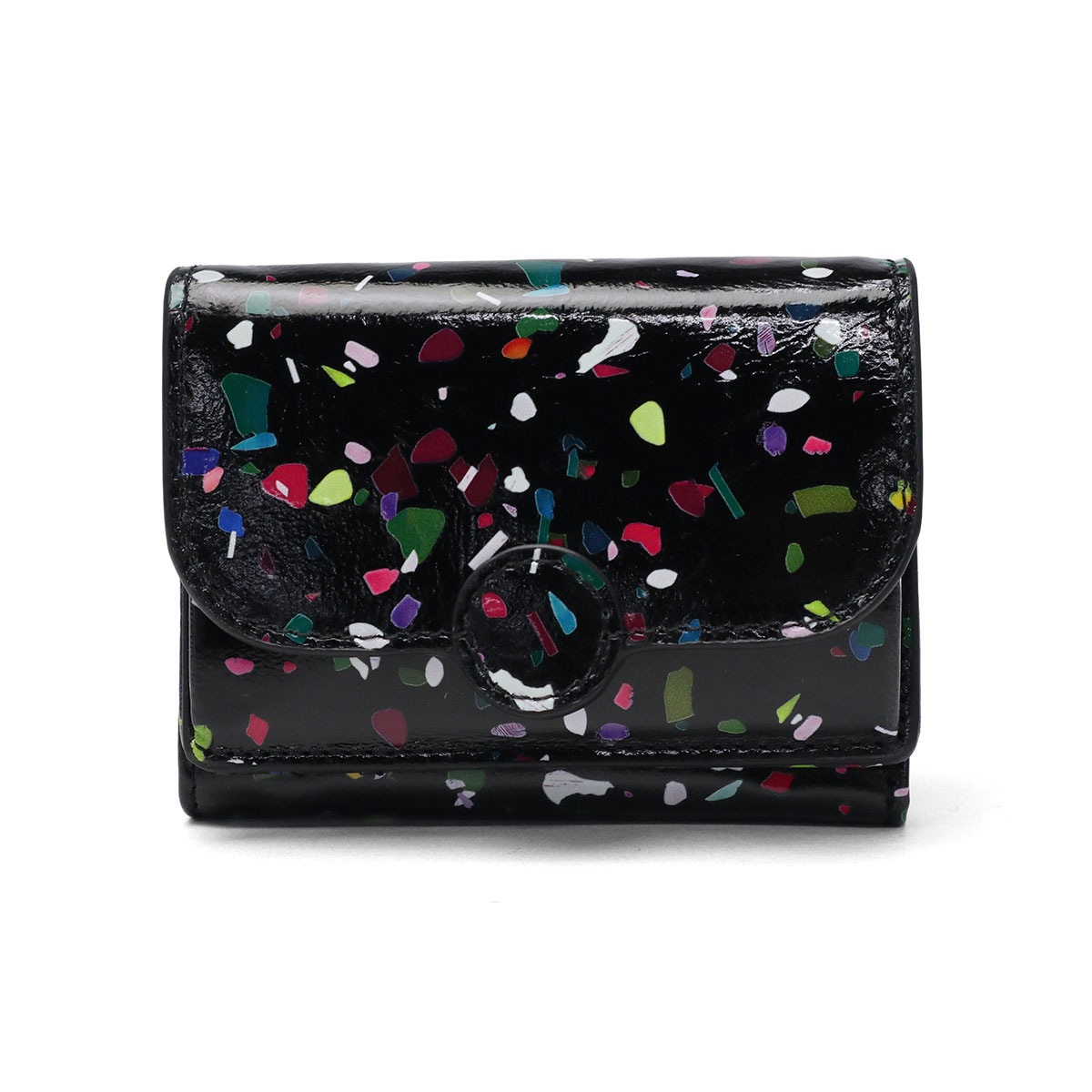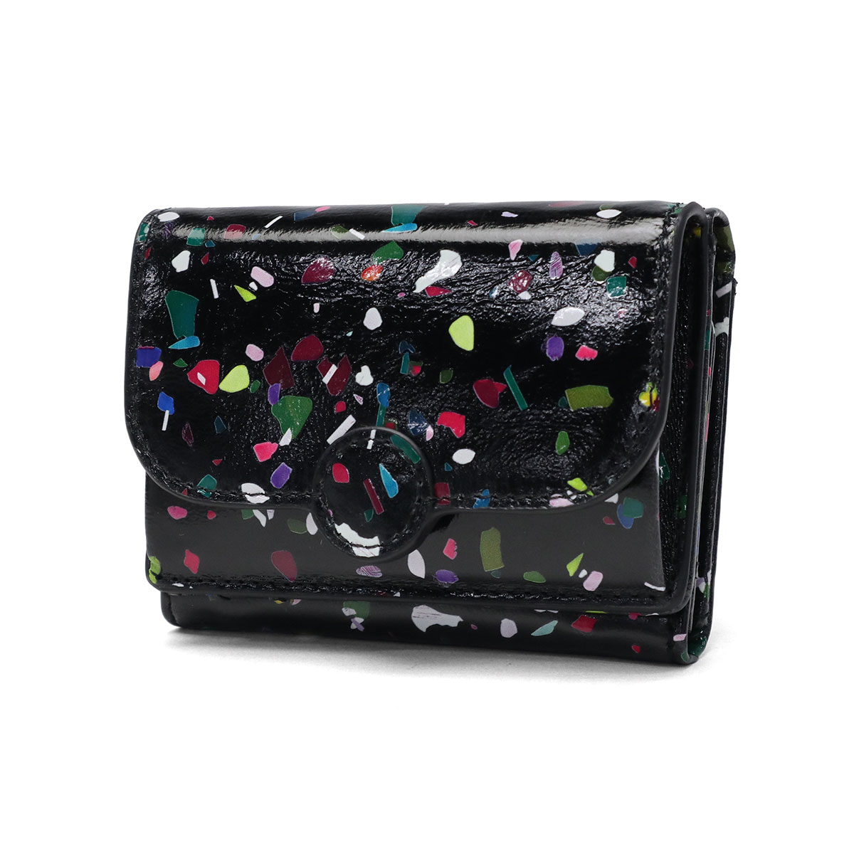 かわいい見た目ながら収納力抜群で、角度によってキラキラ輝く微光沢の三つ折りウォレット。紙吹雪のようなポップなボディは持つだけで幸福感があふれ、ミニサイズでキラキラ柄も取り入れやすく、小物で冒険したい人にもぴったり。柔らかなシープスキン採用で軽量・コンパクト、小銭入れはボックス型でサークルモチーフが優しく、札入れやカード収納も充実。普段使いやギフトにも最適です。