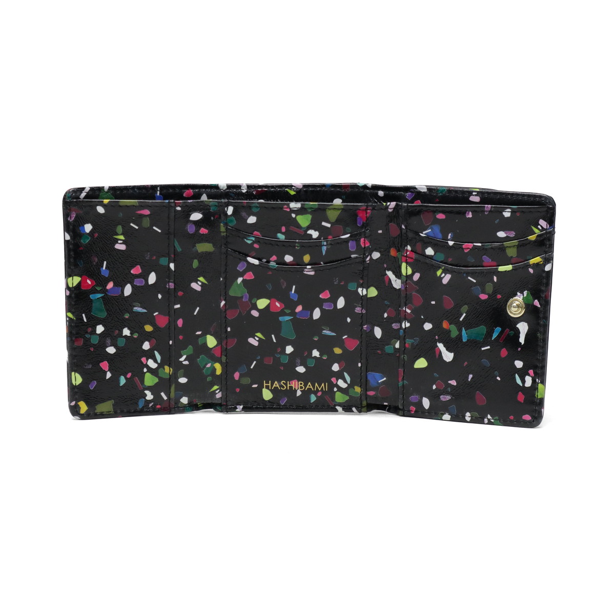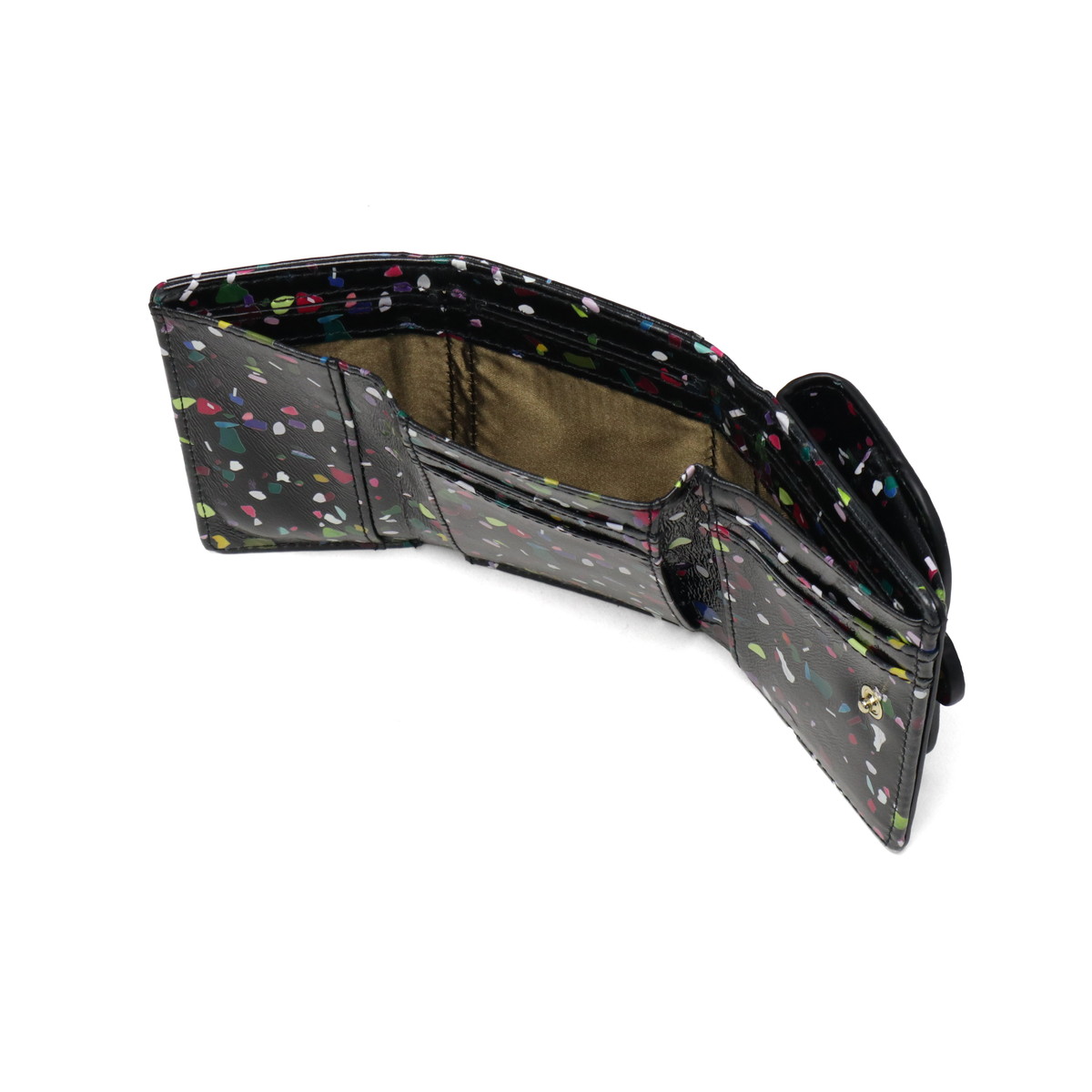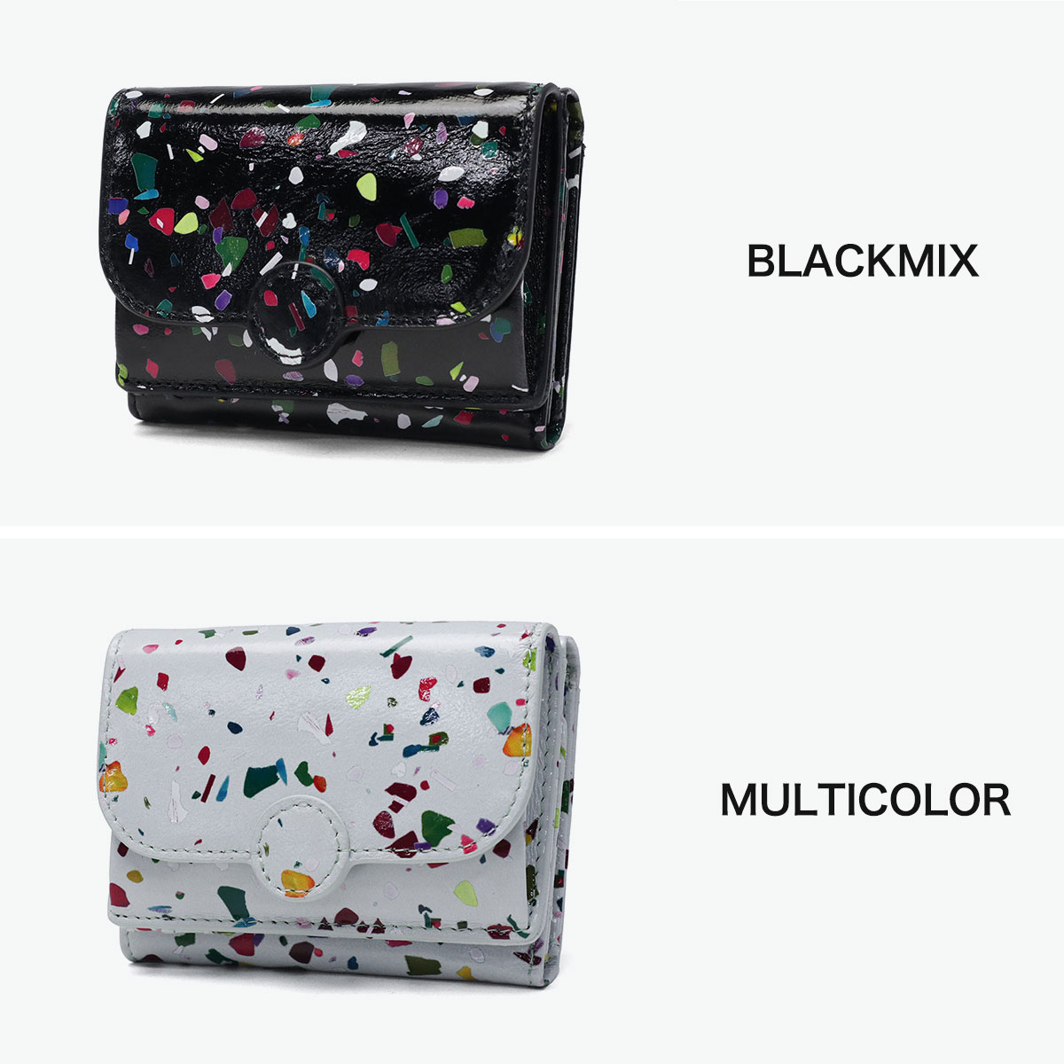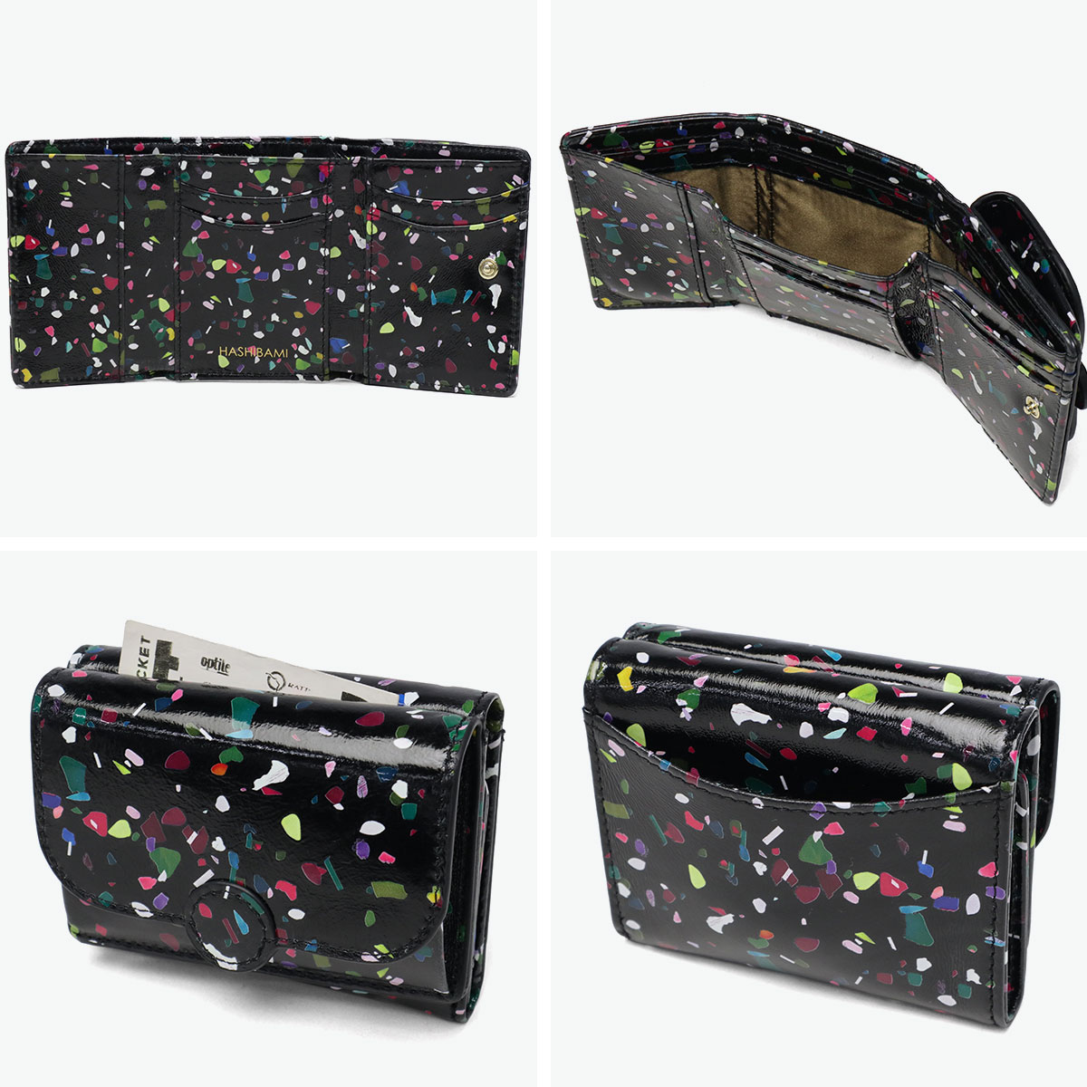 かわいい見た目ながら収納力抜群で、角度によってキラキラ輝く微光沢の三つ折りウォレット。紙吹雪のようなポップなボディは持つだけで幸福感があふれ、ミニサイズでキラキラ柄も取り入れやすく、小物で冒険したい人にもぴったり。柔らかなシープスキン採用で軽量・コンパクト、小銭入れはボックス型でサークルモチーフが優しく、札入れやカード収納も充実。普段使いやギフトにも最適です。