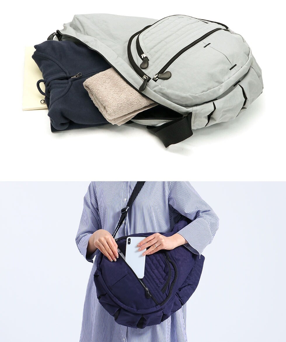 仕様 |[外側] ・ジップポケット(L)×1[キーホルダー×1 内蔵] ・ジップポケット(L)×1 ・ポケット(L)×1 ・ジップポケット(M)×1[クリアポケット(S)×1、ポケット(S)×1、ペンホルダー×3、キーリング×1 内蔵] ・ジップポケット(M)×1 ・ボトルホルダー×1 [内側] ・ジップポケット(L)×1 ・ポケット(L)×2 ・メッシュジップポケット(M)×1 ・メッシュポケット(S)×1 ・メッシュポケット(S)×3 ・キーリング×1 [付属品] ・ポーチ×1