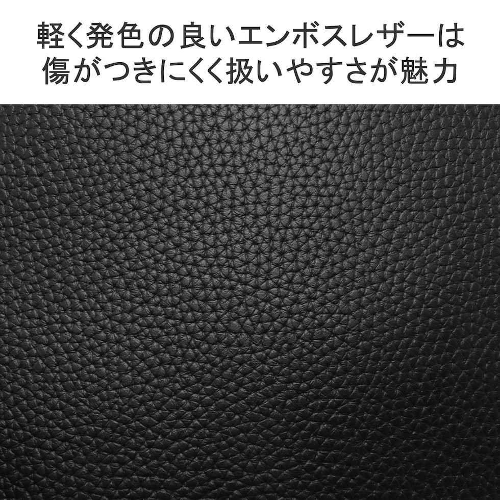 素材には軽さと発色の良さが特徴のエンボスレザーを採用。自然なシボを再現した型押しを施しています。表面に傷が付きにくく、タフで扱いやすいのが魅力的。経年変化による色の変化が生じにくく、綺麗なまま使い続けられるレザーです。