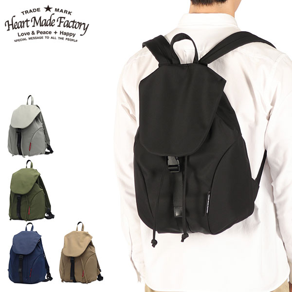 少し懐かしい印象の『Heart Made Factory』のリュック。サイドポケットが特徴的なデザインで、収納口は巾着のように絞れるフラップ式。シンプルでありながら、ジェンダーレスでお使いいただけるカラーリングとデザインとなっています。