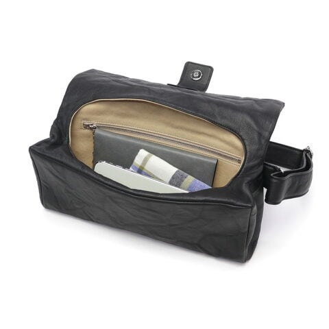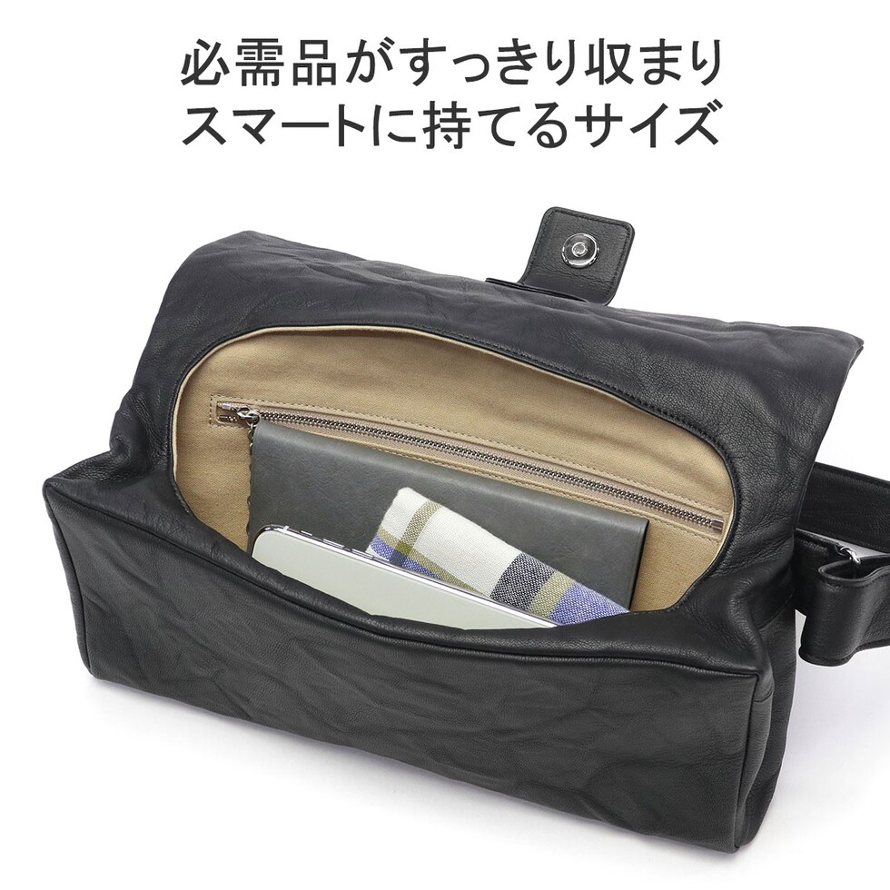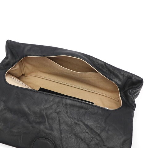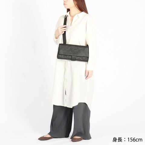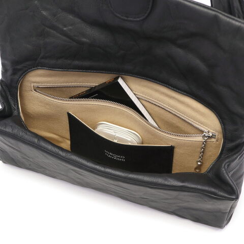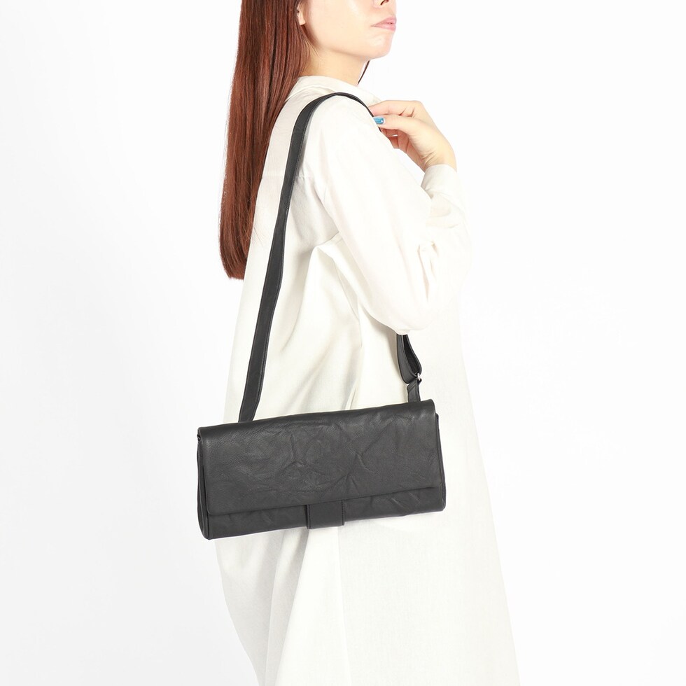 イタリアに伝わる魔女をモチーフとした『BEFANA/ベファーナ』シリーズのショルダーバッグ。クシャクシャに丸めた紙を広げたような表面とショルダー型の組み合わせが魅力です。本体と蓋が一体のユニークな作りはヒロコハヤシならでは。シワ感を生かすため、極力ステッチを見せない方法で作り上げてます。