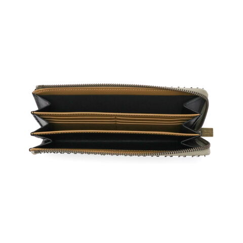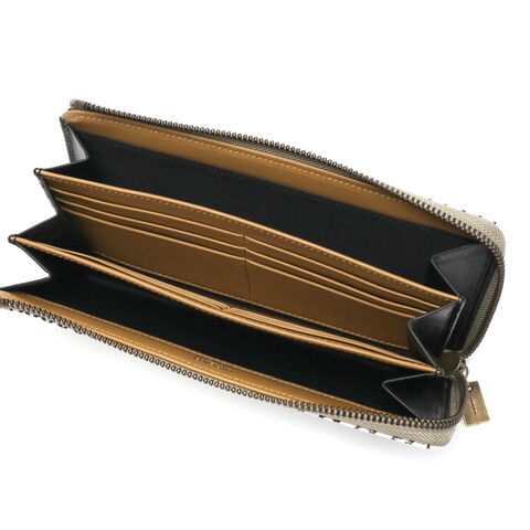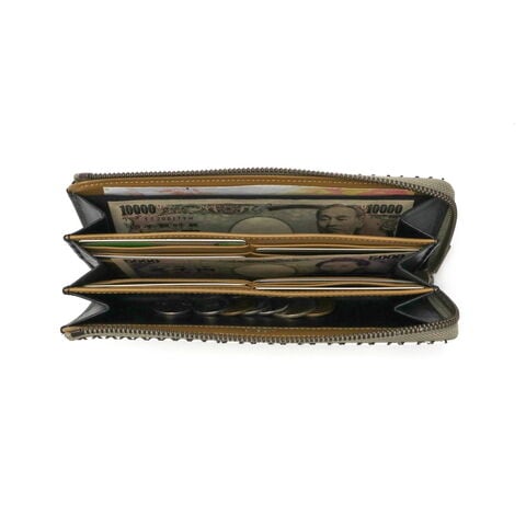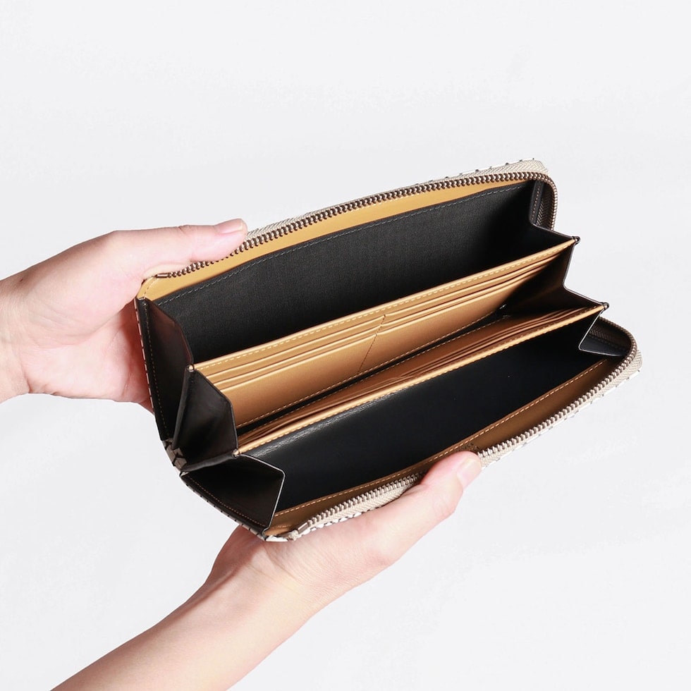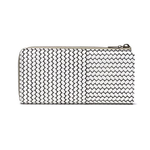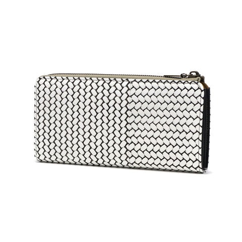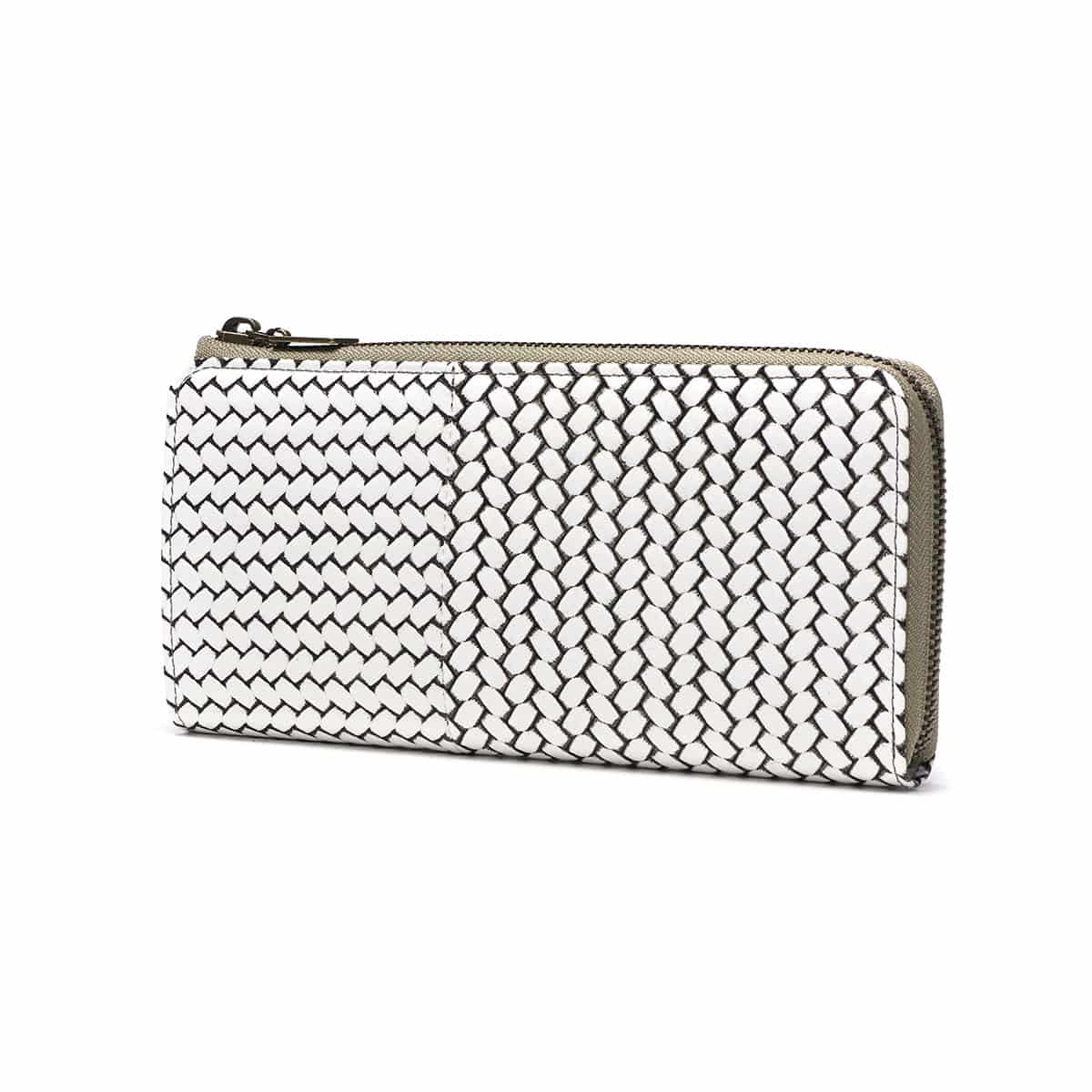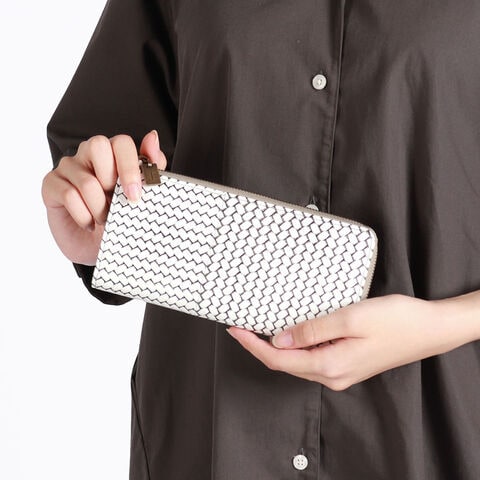 編み目柄が特徴的な『OTTICA/オッティカ』シリーズのL字ファスナー式長財布。型押しを施した牛革に墨色の染料を塗り、最後にふき取ることで味を出しています。本体は、お札、小銭、カードがたっぷり収納できる大容量の設計です。浅型に作られた小銭入れやカードをすっきりしまえる12個のカードポケポケットなど、使いやすさにも配慮されたアイテムに仕上がっています。