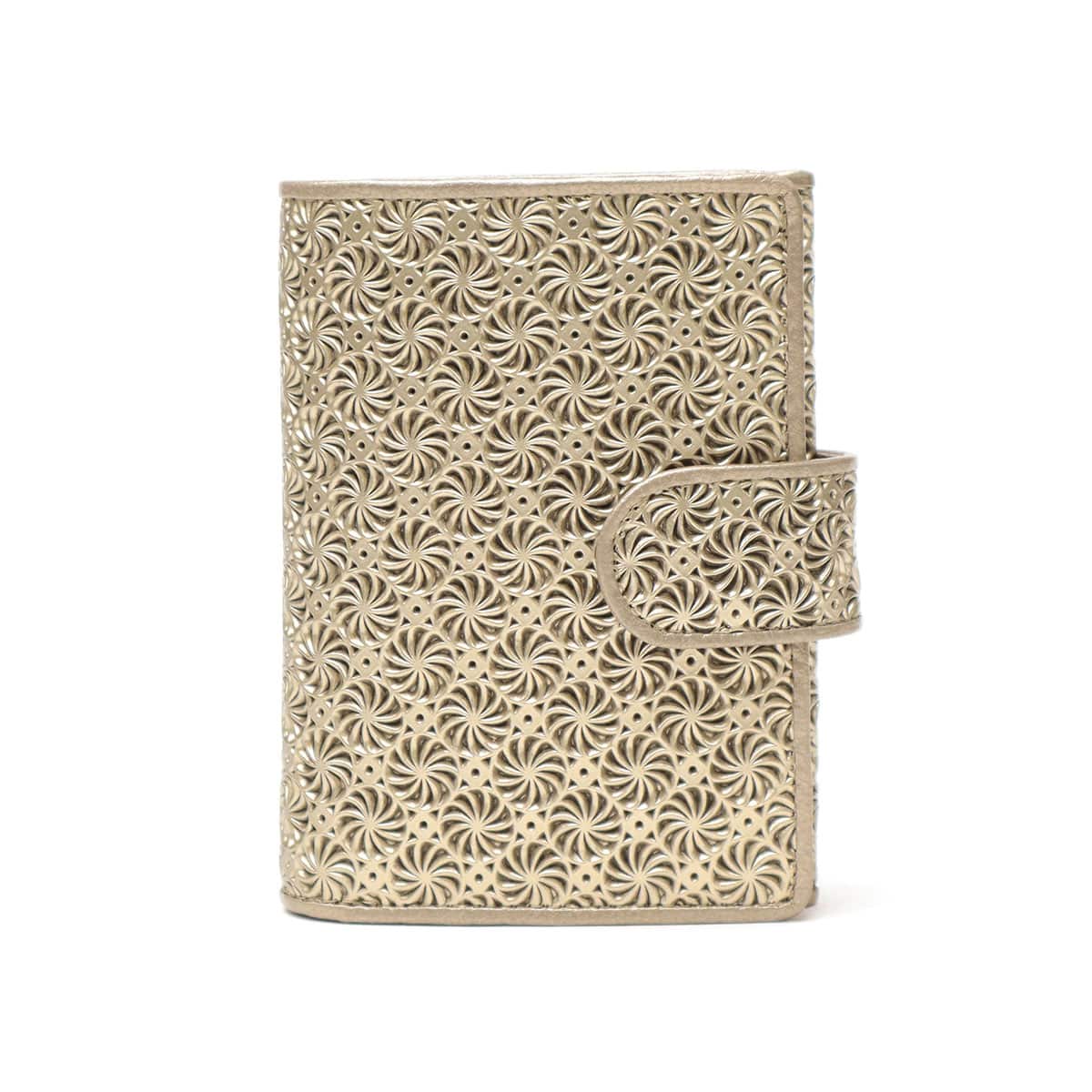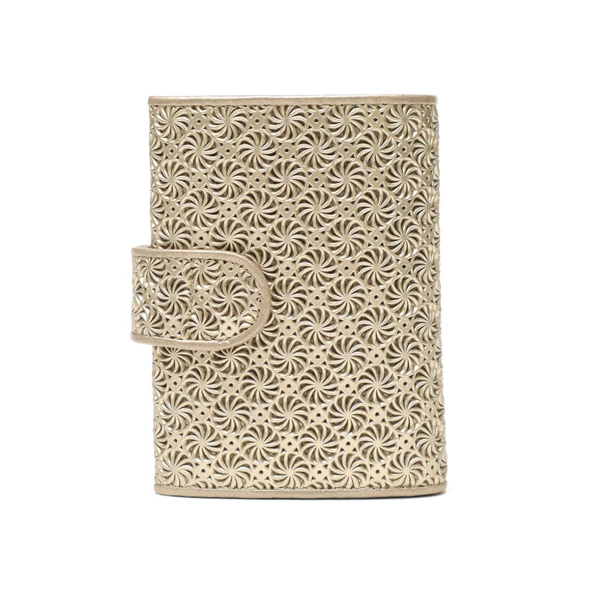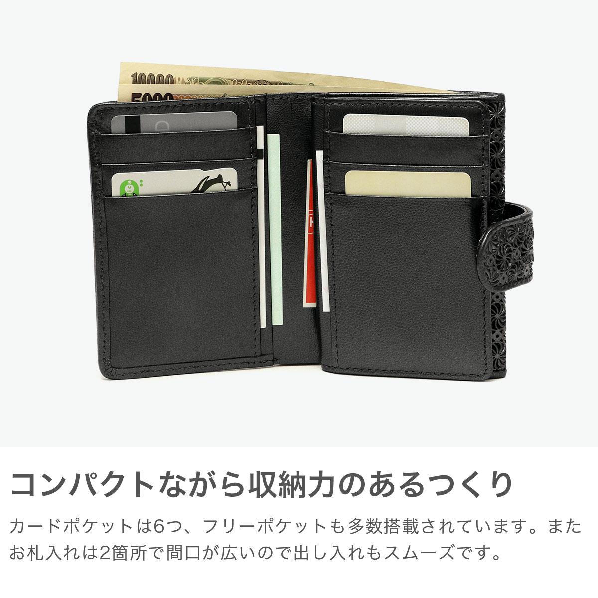 独特なスクリューデザインが人気の『GIRASOLE/ジラソーレ』シリーズの二つ折り財布。牛革に型押しと型抜きを施した、上品でいて軽やかな仕上がりが特徴です。小さい財布だと収納力に不安があるという方にちょうど良い中型サイズで、2層式の札入れや豊富なカードポケットなど、機能面も充実のアイテムです。