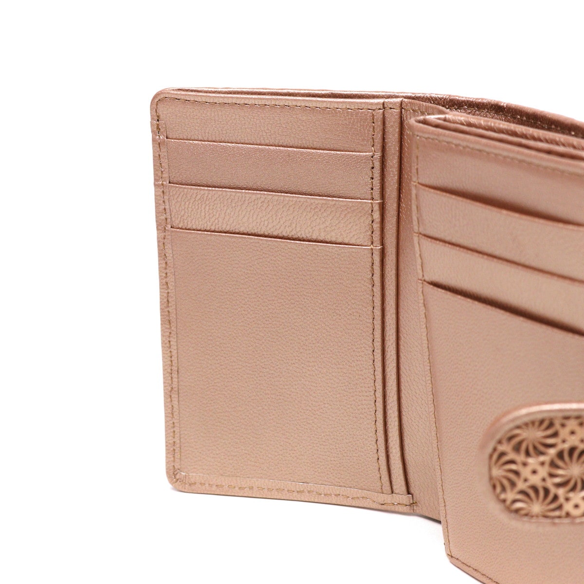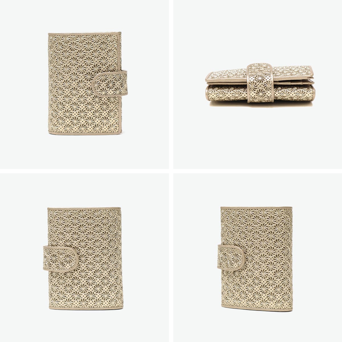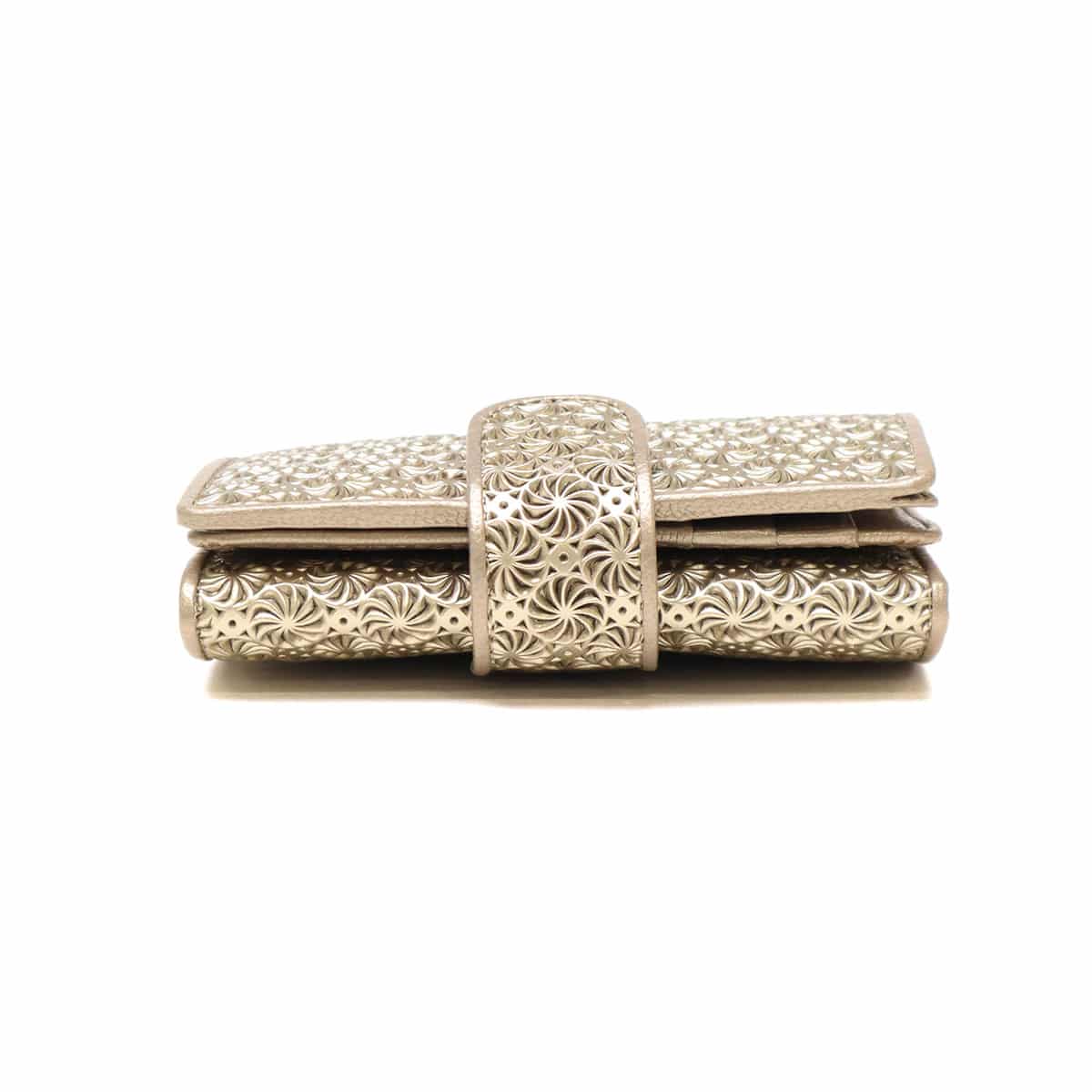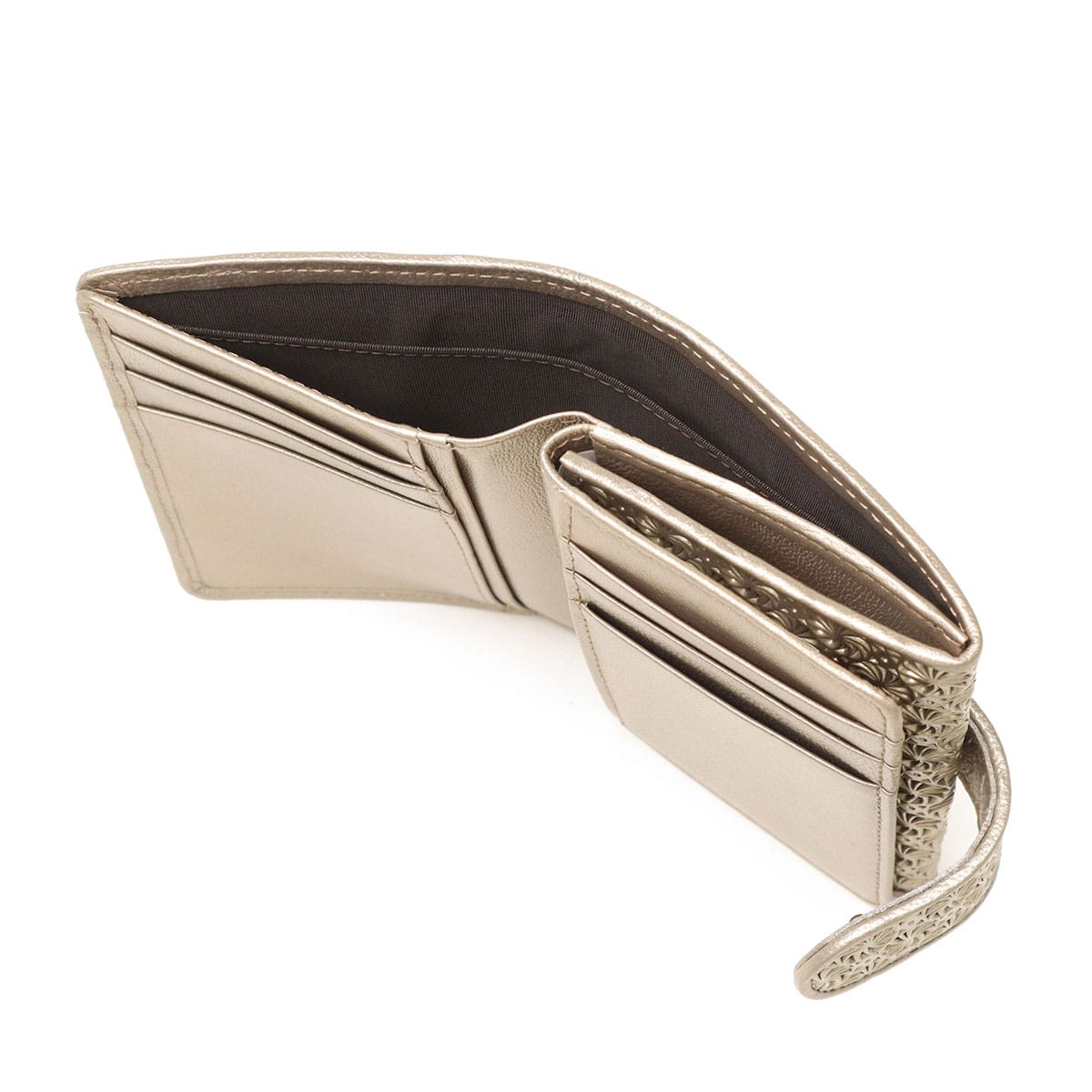 独特なスクリューデザインが人気の『GIRASOLE/ジラソーレ』シリーズの二つ折り財布。牛革に型押しと型抜きを施した、上品でいて軽やかな仕上がりが特徴です。小さい財布だと収納力に不安があるという方にちょうど良い中型サイズで、2層式の札入れや豊富なカードポケットなど、機能面も充実のアイテムです。