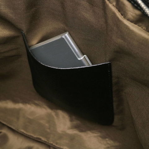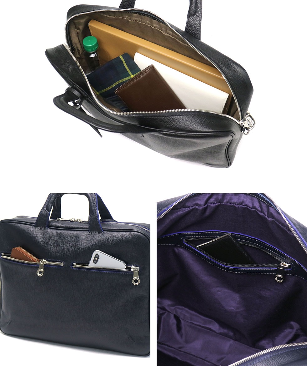 メイン収納部はA4サイズの書類や手帳などのビジネスアイテムがコンパクトに収まるサイズ感。程よくマチ幅があるのでペットボトルやお財布もまとめられます。内外にはスマートフォンやパスケースなどの小物収納スペースが設けられているので、バッグ内で小物が散らばらずにクリアに管理していただけます。