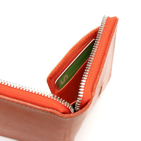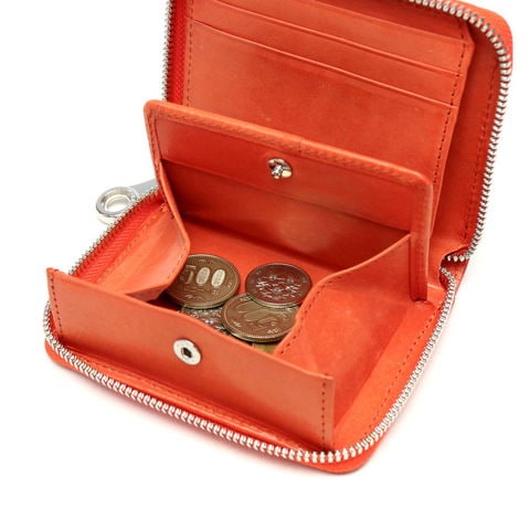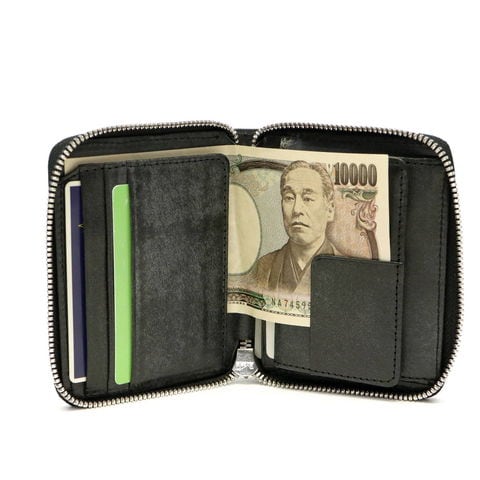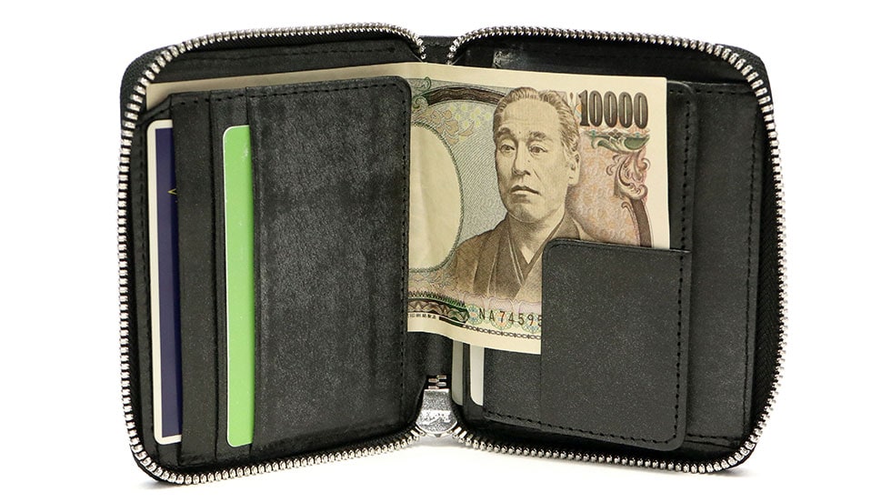 収納部は大きく開き、紙幣や小銭、カード全てにアクセスしやすいのがポイント。ボックス型小銭入れや、札入れの代わりに配置した「札留め」は出し入れがしやすく便利です。紙幣は「札留め」とカード棚背面を使って挟み込んだり、折り畳んでそのまま収納しファスナーで閉じたりと使い方は自由自在です。