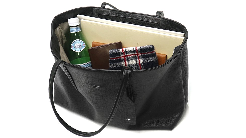 収納部は、A4サイズのファイルや長財布、タオルなど日常的に持ち運ぶアイテムの収納に最適。500mlのペットボトルは縦向きにぴったり収まる実用的なサイズ感になっています。また、底面にはマチが付いており、床置きに配慮されているのもポイント。