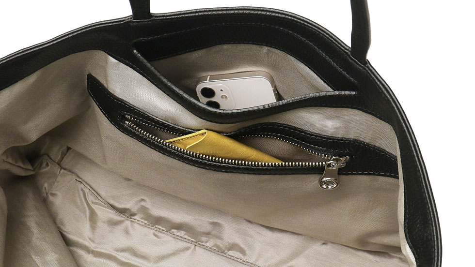 収納部の前面側、背面側にはそれぞれあおりポケットを装備。スマートフォンやパスケース等使用頻度の高いアイテムがスムーズに取り出せる気の利いたデザインになっています。シンプルな外観ながら、機能的な収納ポケットで充実している点も魅力的です。